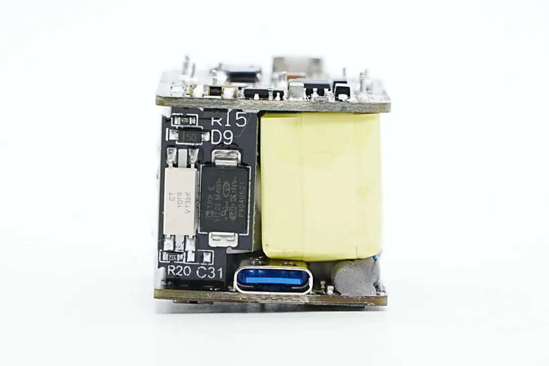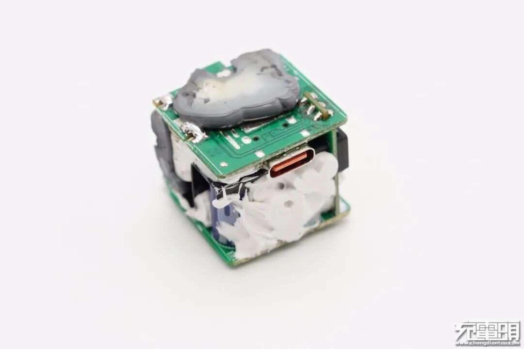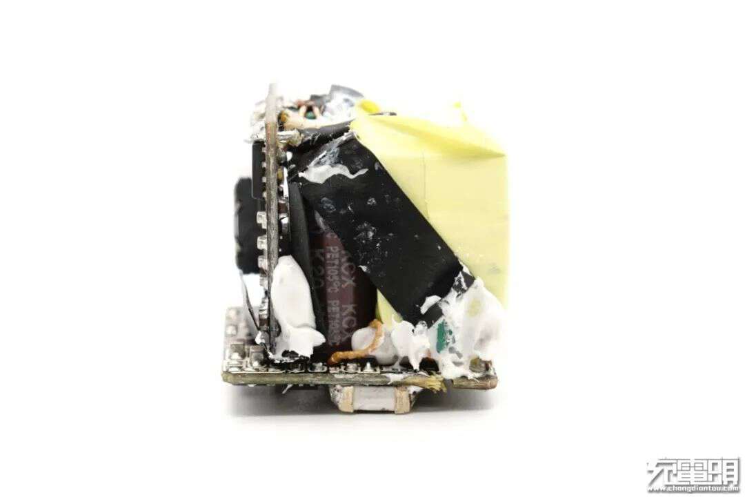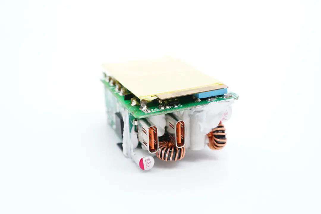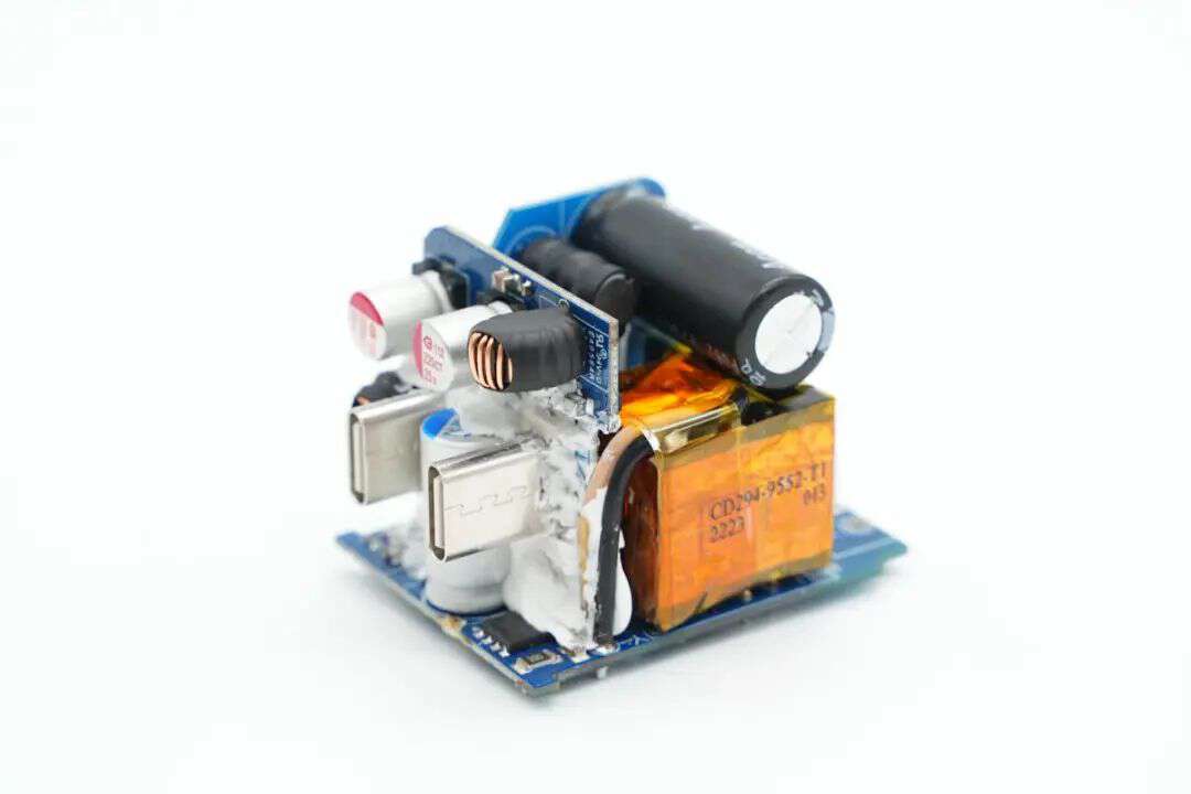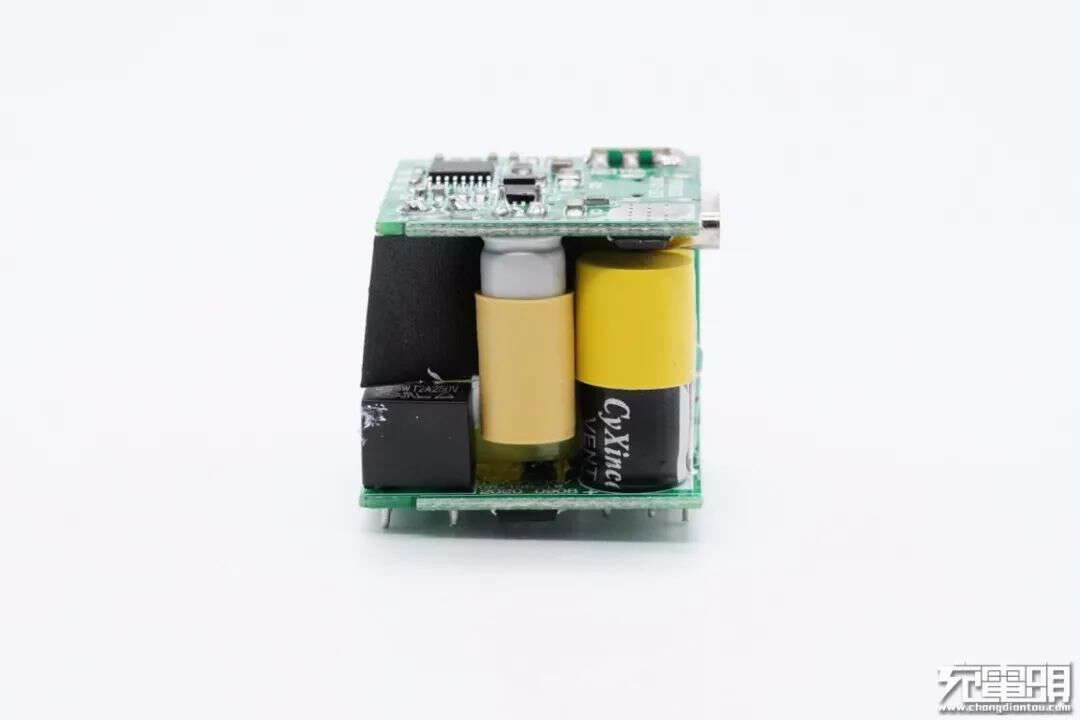 模块初级侧的保险电阻、高压滤波电解电容均做了绝缘处理。采用经典QR开关电源架构,同步整流芯片采用杰华特JW77186B,内置耐压60V MOSFET,永铭小体积电容进行同步整流输出滤波,云矽半导体XPD738协议IC控制双口输出。除小板堆叠有效利用内部空间外,上述器件的使用也帮助模块实现小型化。