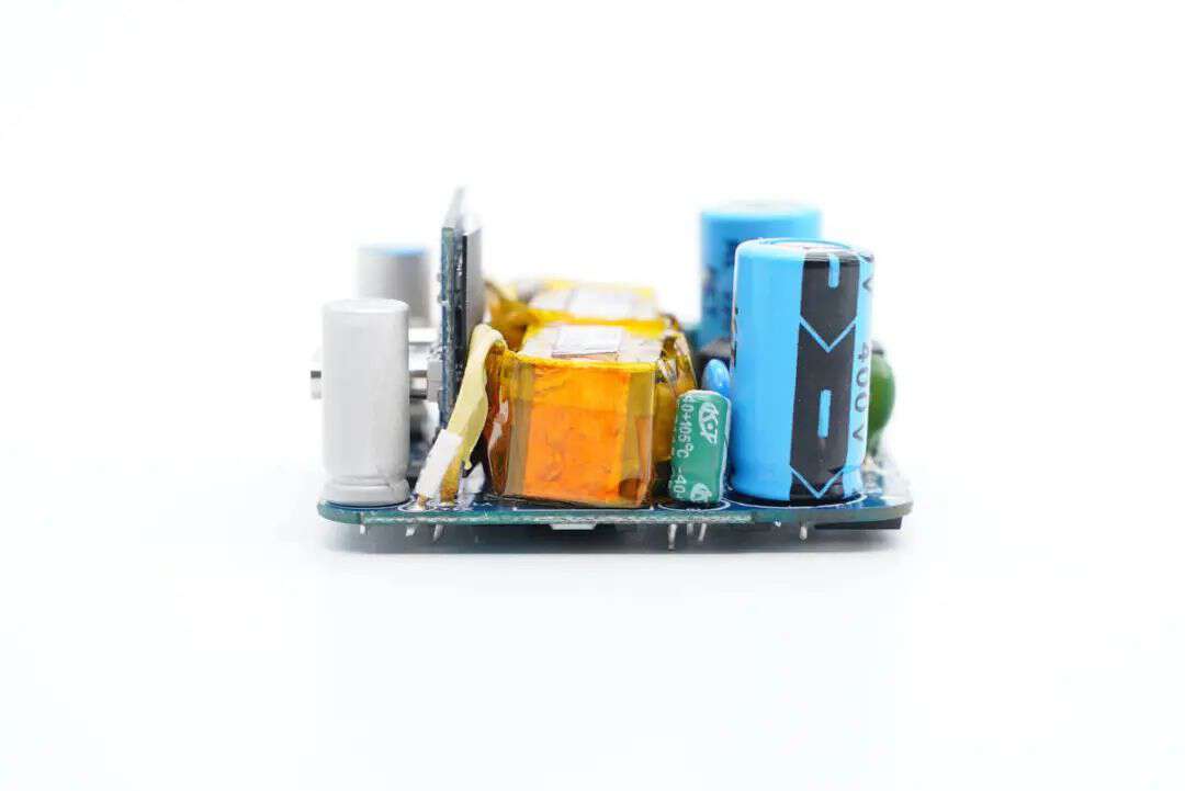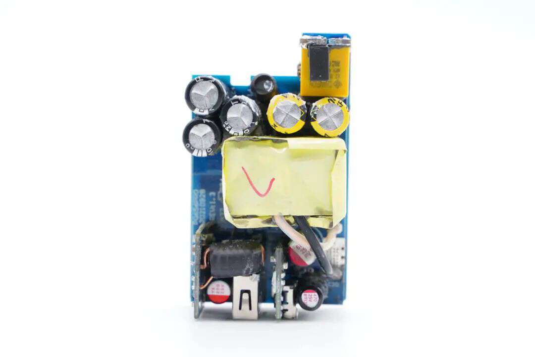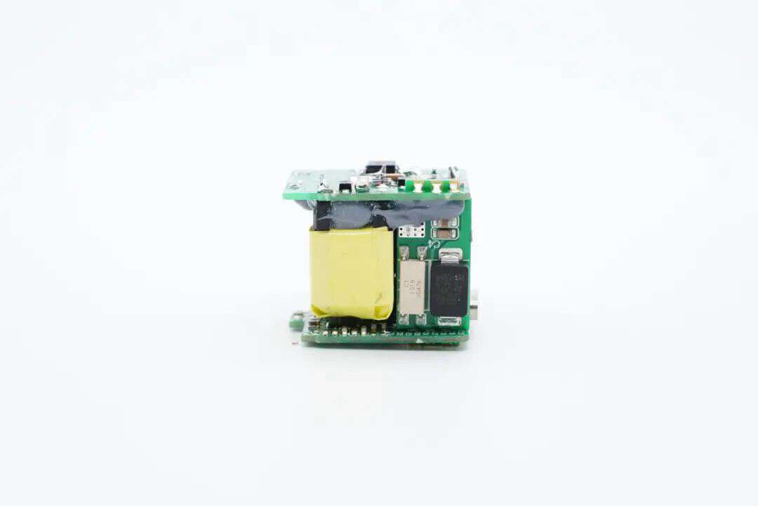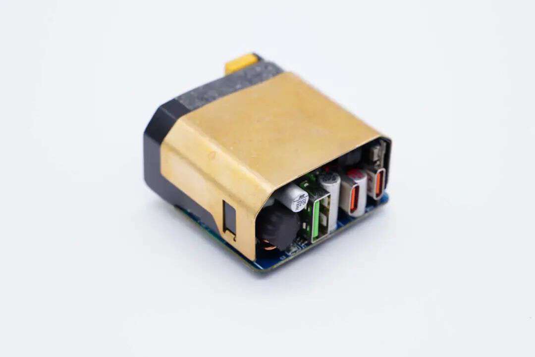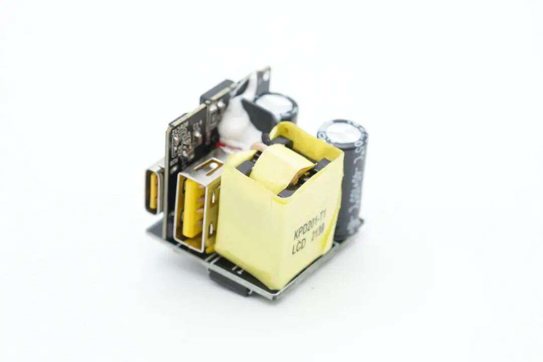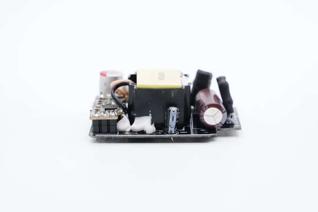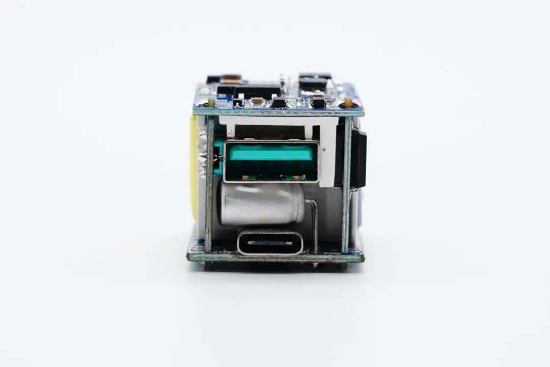 模块初级侧的保险电阻、高压滤波电解电容均做了绝缘处理。采用经典QR开关电源架构,同步整流芯片采用杰华特JW77186B,内置耐压60V MOSFET,永铭小体积电容进行同步整流输出滤波,云矽半导体XPD738协议IC控制双口输出。除小板堆叠有效利用内部空间外,上述器件的使用也帮助模块实现小型化。