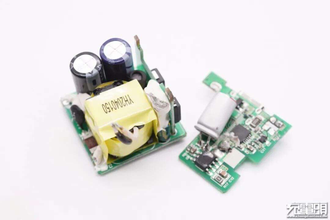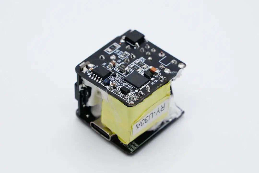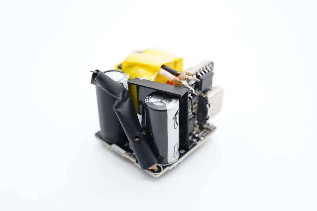 这款充电器采用三块电路板组合焊接,U型结构,内部采用绝缘支架组合成为一个整体。内部开关电源方案采用华源智信HYC3602E+HYC9012A电源方案,特锐祥的贴片Y电容,分别集成高压氮化镓开关管和低压同步整流管,方案集成度高,效率高,外围元件简单,满足30W快充应用。