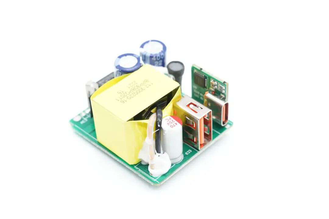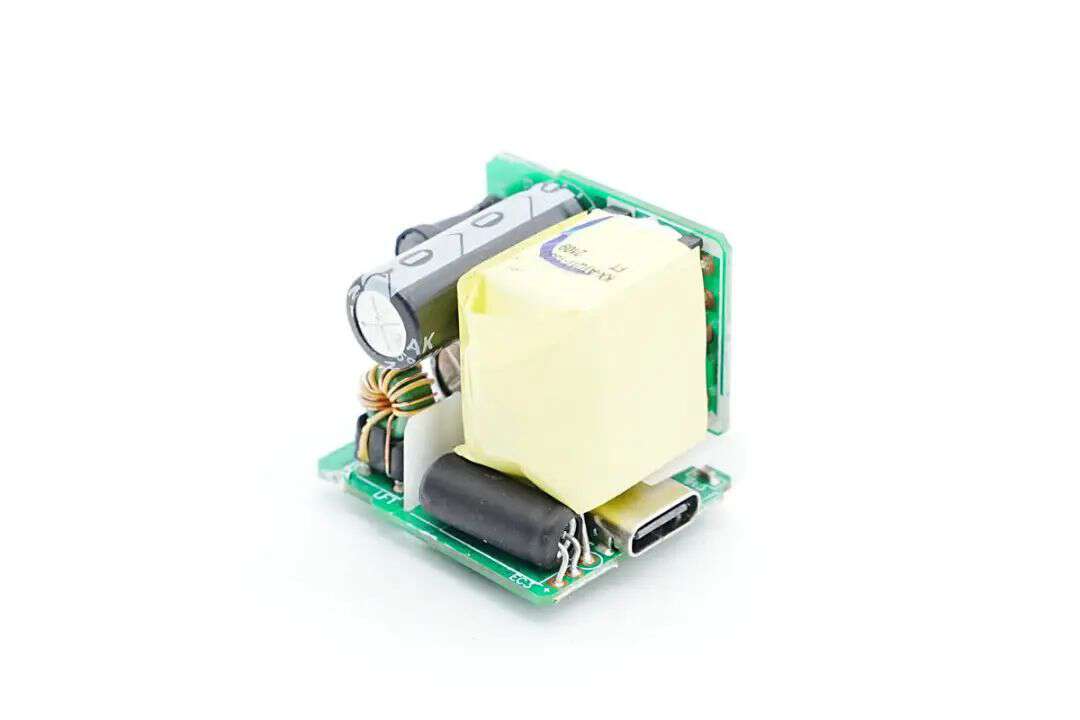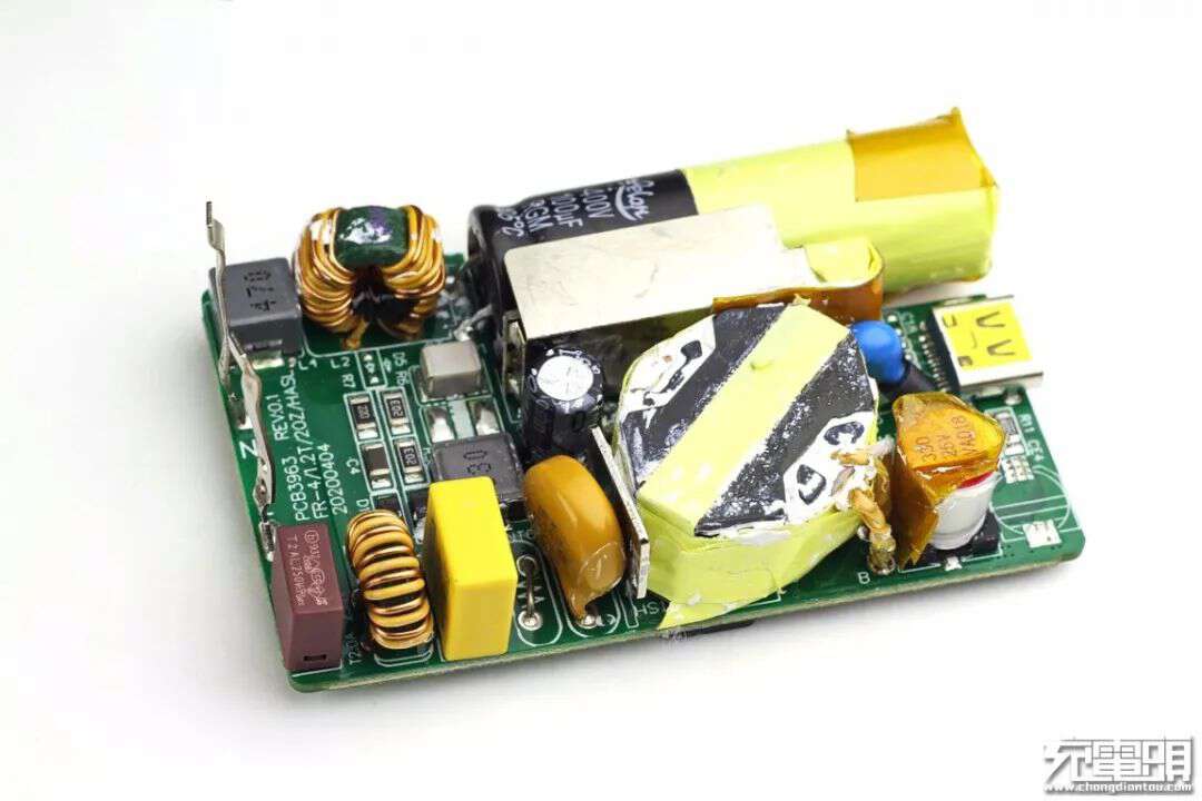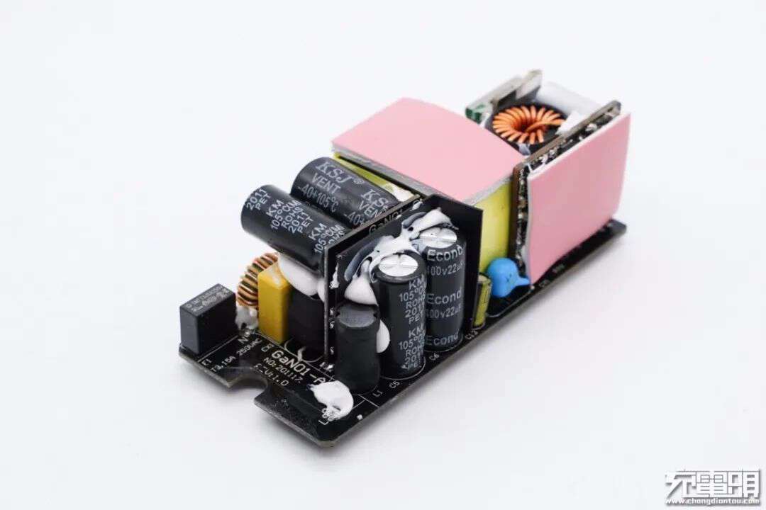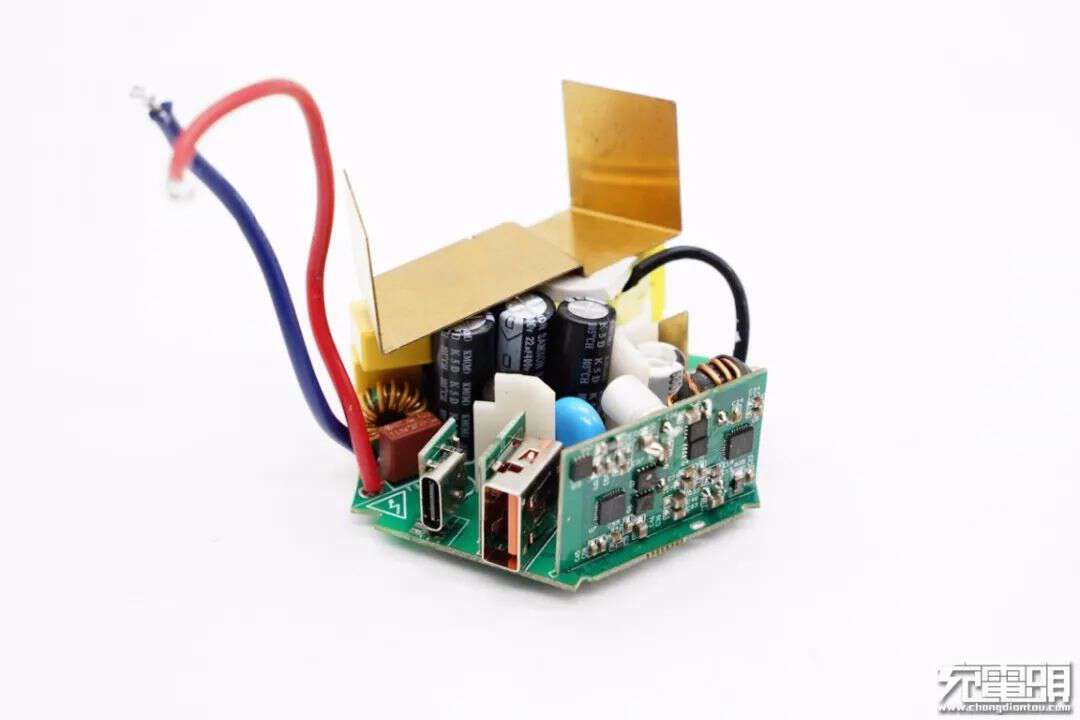 这款充电器采用了开关电源宽范围输出,协议芯片控制输出电压的典型架构。充电器的AC-DC部分,初级由搭载GaN开关管的模块小板组成,内置美国transphorm公司的高性能GaN开关管,次级由同步整流控制器MP6908A搭配万代MOS组成;输出部分由昂宝USB PD协议芯片OB2613控制。