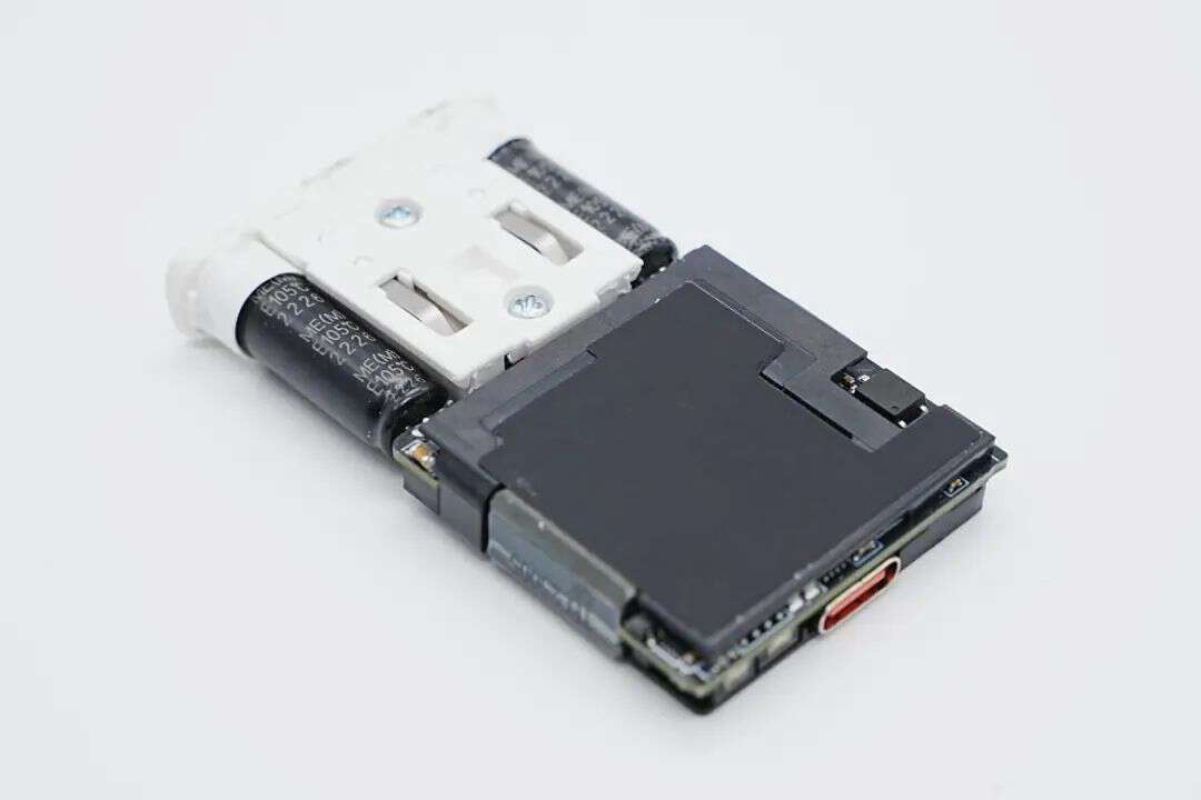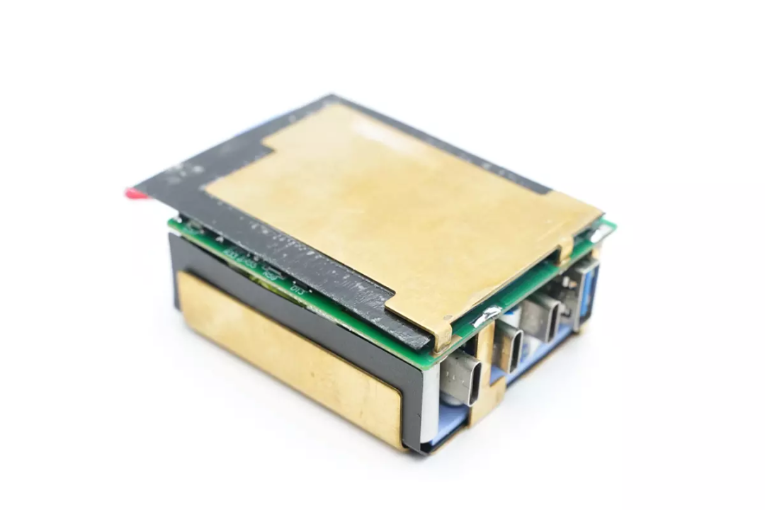 这款充电器开关电源部分,由安森美NCP1342搭配镓未来科技有限公司的氮化镓功率芯片G1N65R240PB,以及芯茂微LP35118V搭配新功率同步整流管组成;输出端采用智融SW3516H+锐骏RUH4040M2进行二次降压输出,贴片电容来自特锐祥TMY1102M。基于上述方案设计,充电器采用三段式布局结构,层次清晰,输入输出均设有小板以充分利用内部空间缩小产品体积。