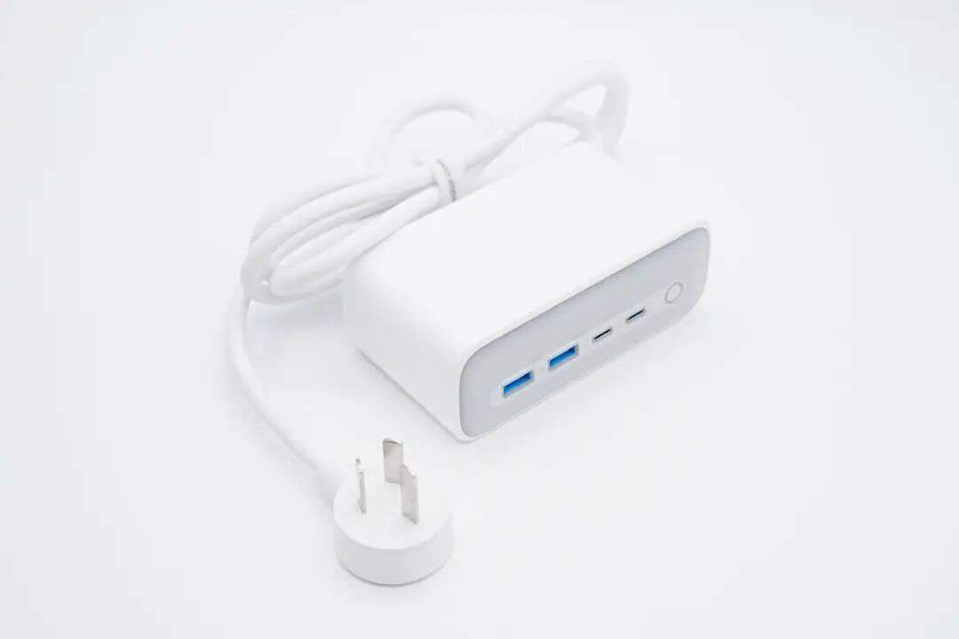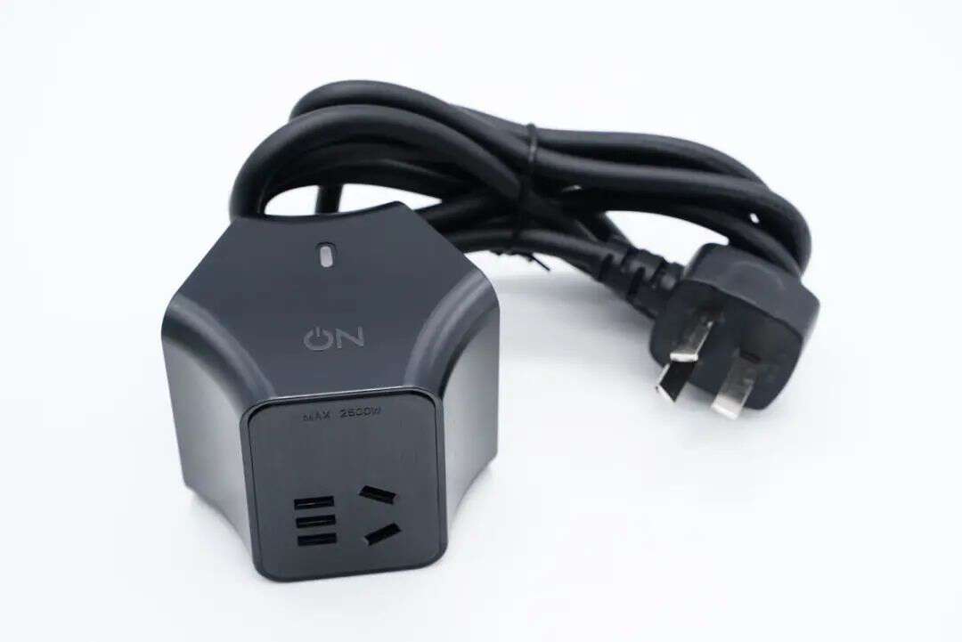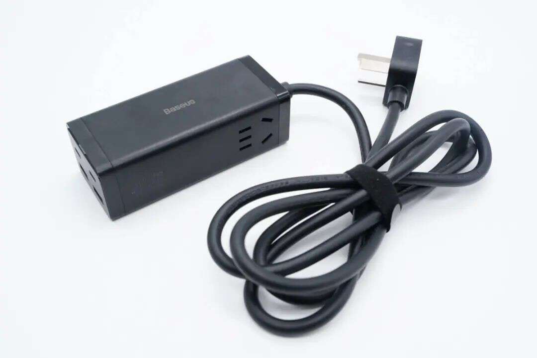 倍思100W氮化镓快充插座自带1.5米长延长线缆,满足日常扩展使用。插座两侧具备2+3交流插座,支持2500W功率,使用自带的100W USB PD快充为笔记本充电,连接一个显示器,再插一个热水壶也是极好的。