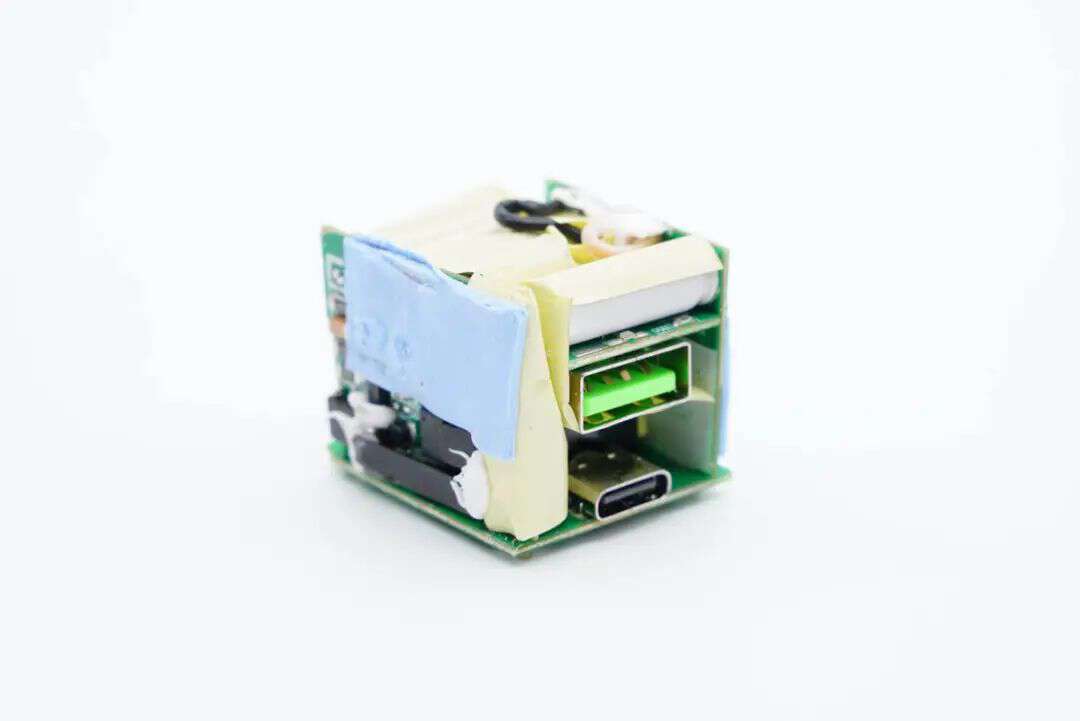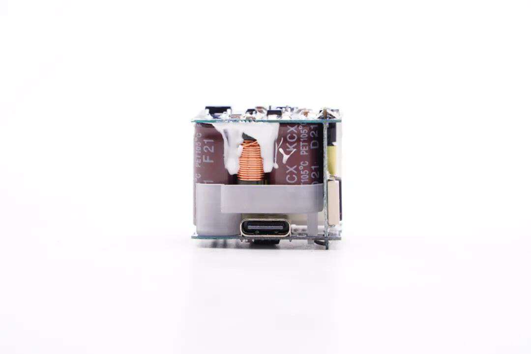 充电器采用三块小PCB板相互垂直焊接,结构十分稳定。采用了南芯SC3021D+SC3503高频QR开关电源方案,英诺赛科INN650DA04二代氮化镓功率器件,这套方案已量产并应用在很多大品牌的迷你充产品上,性能质量得到市场验证,获得客户一致认可。