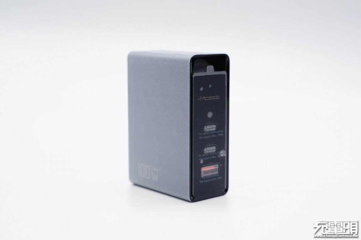 绿联100W 3C1A氮化镓快充充电器延续了方块造型设计,两侧微弧,PC防火外壳表面采用黑色金属漆工艺,使得产品看上去更有气质,同时也能获得不错的使用手感。产品接口多,自然也支持100W、65W+30W、65W+22.5W等多种充电策略,同时接口兼容QC、AFC、FCP、SCP、PE2.0、PD、PPS多个快充协议,兼容性很好,满足各大品牌设备快充需求。