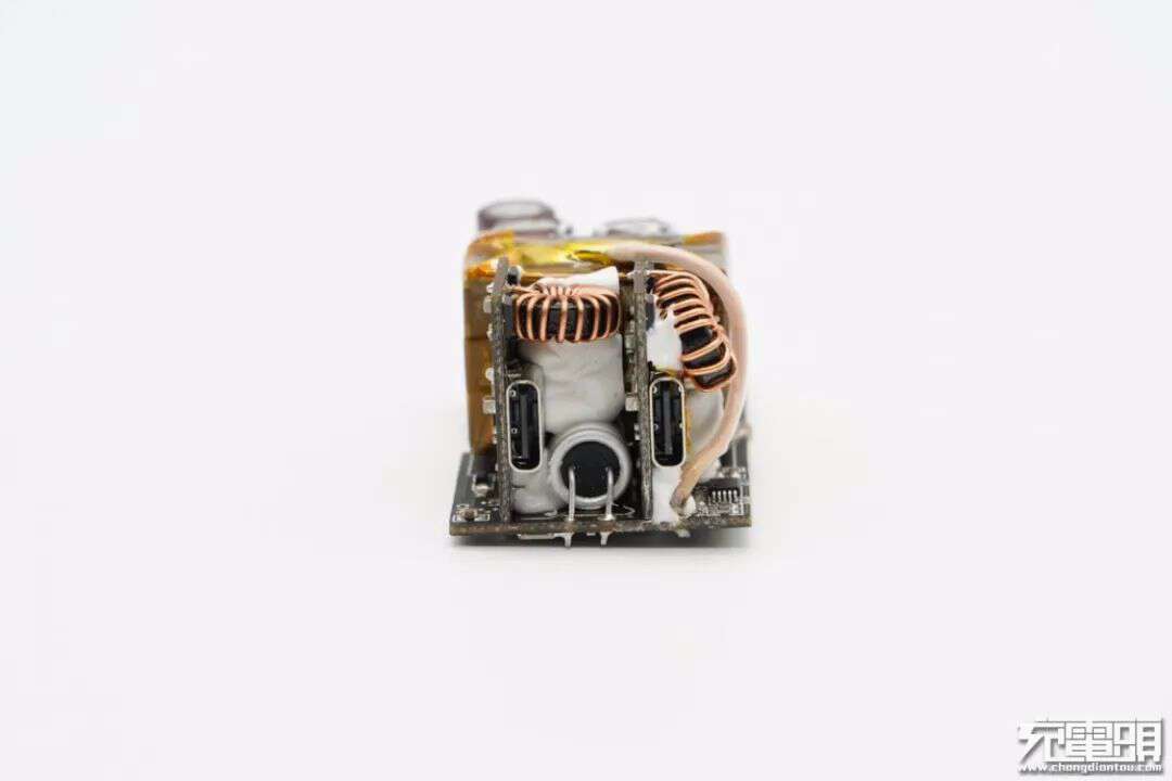 作为一款柱状造型充电器,内部采用了经典的三段式布局设计,层次分明,输入输出端设有小板,充分利用内部空间。其次充电器采用开关电源加两路DC-DC架构,也很典型。