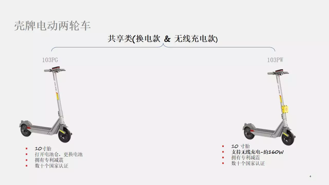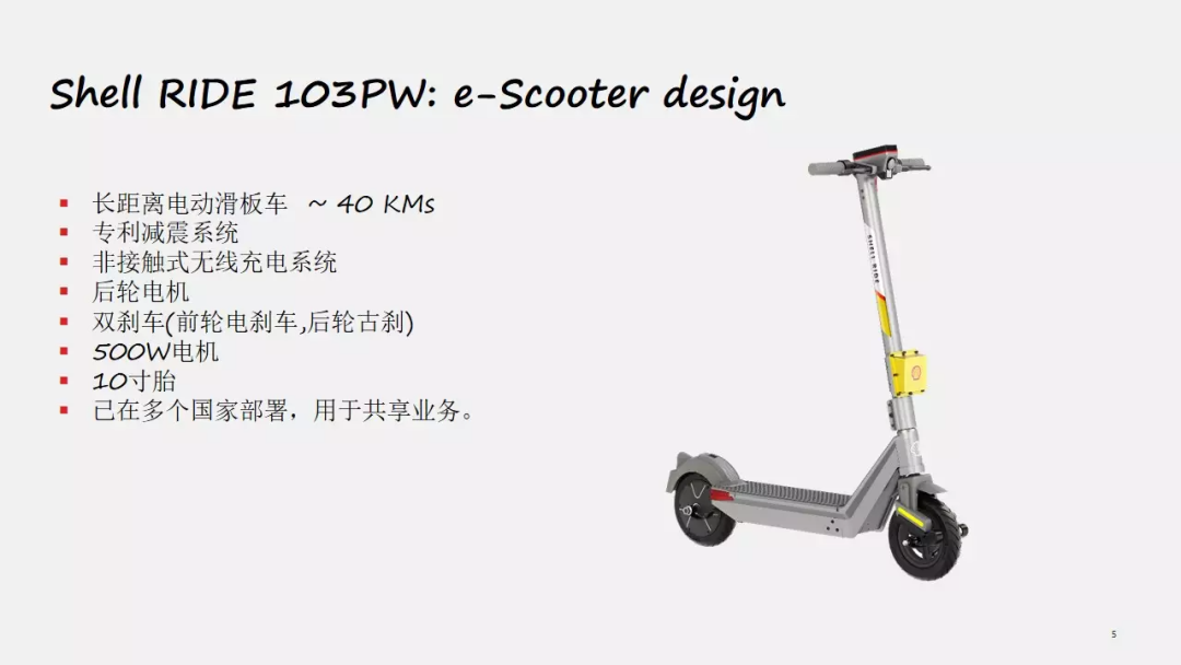 壳牌共享类电动两轮车有换电款(103PG)和无线充电款(103PW),前者采用两个10寸轮胎,内置专利减震系统,行驶平稳。此外基于换电概念设计,打开电池仓更换电池简单方便,即换即用无需等待,两款车型都获得了数十个国家的相关认证。