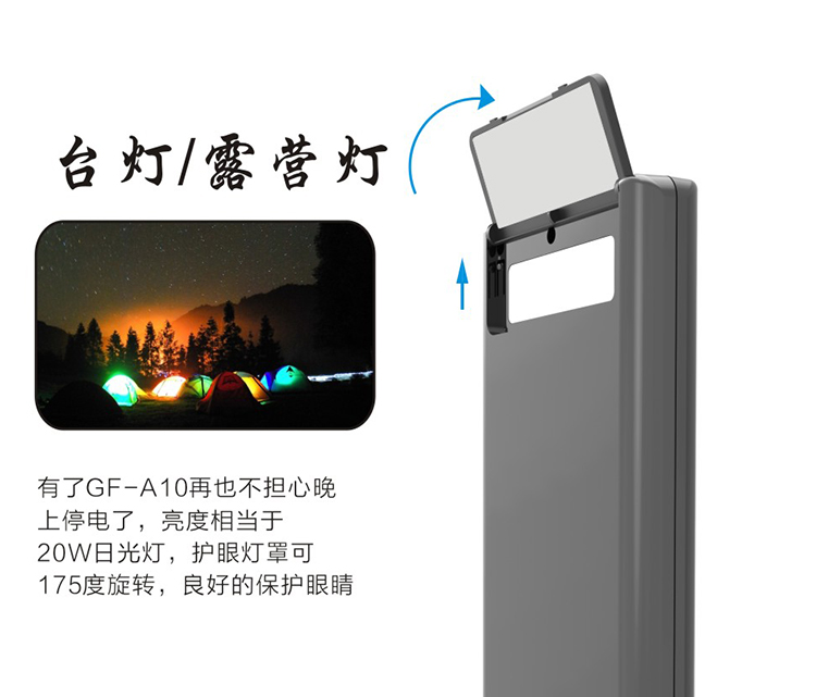 品冠10000mAh移动电源,翻开上方的灯罩就能摇身一变成为明亮的台灯或者露营灯,而且灯罩可以0~175度自由翻转,不用担心灯光刺眼。正面的电源开关还可以用来点亮台灯,只需长按两秒,还支持三挡亮度调节。