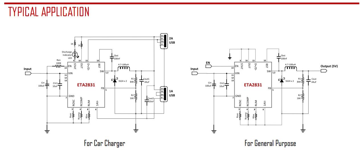ETA2831专为高电压输入的USB充电应用设计,它具有4V-36V的宽输入电压范围,高效率高频率的开关降压稳压器,提供高达4A的输出电流和一个低侧USB电流限制开关。芯片的工作频率可以由外部设置,同时具有线路电阻补偿功能,可以由用户设置输出电压以应对数据线的压降。芯片具有过压保护功能以保护芯片自身以及输出负载,输入最高电压高达42V,汽车的电瓶电压在芯片的工作电压范围内,使其可以应用在工业应用和汽车应用上。