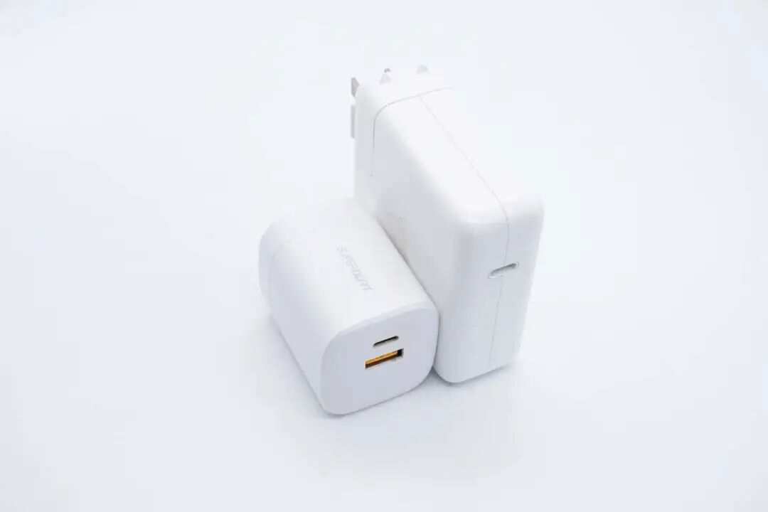 真我realme 67W双口充电器厚度约为42.05mm,体积约为84.32cm³,以充电器的功率67W计算,功率密度约为0.79W/cm³。与苹果原装67W充电器相比,体积优势非常明显。