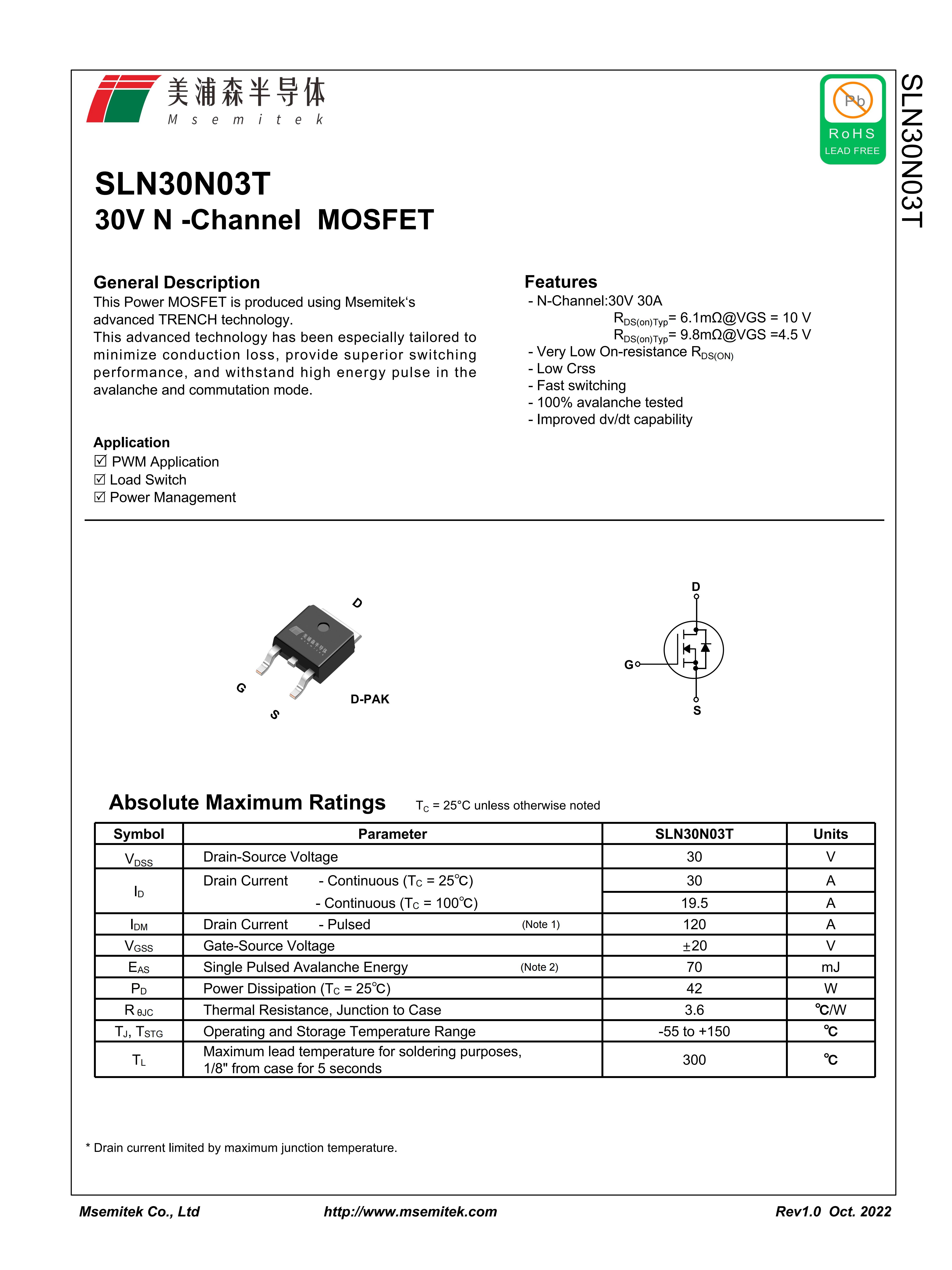 两颗同步降压开关管来自美浦森,型号SLN30N03T,是一颗耐压30V的NMOS,导阻为6mΩ,采用DFN3*3封装。SLN30N03T采用了先进的平面条形沟槽技术,能最大限度地减少导通损耗,提供卓越的开关性能,并在雪崩和换向模式下能承受高强脉冲,安全性能好,可靠性更高,适用于PWM控制器、负载开关以及电源管理等多个领域。