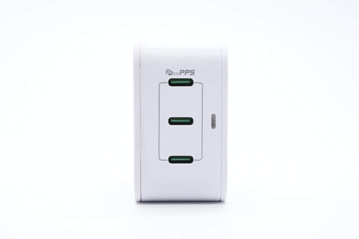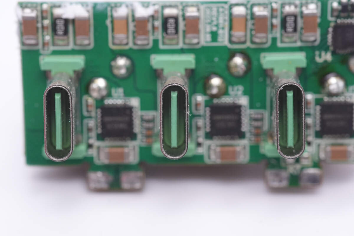 输出端配备三个USB-C接口,接口胶芯均为绿色。