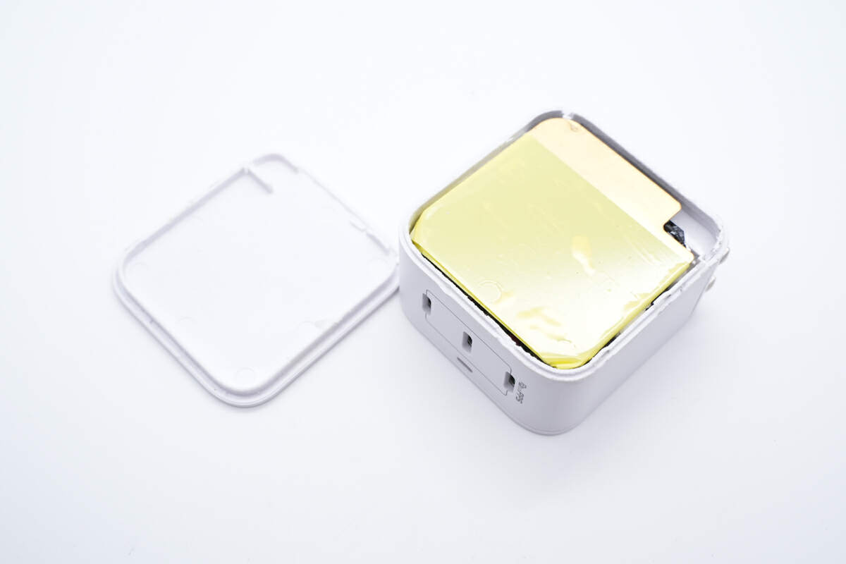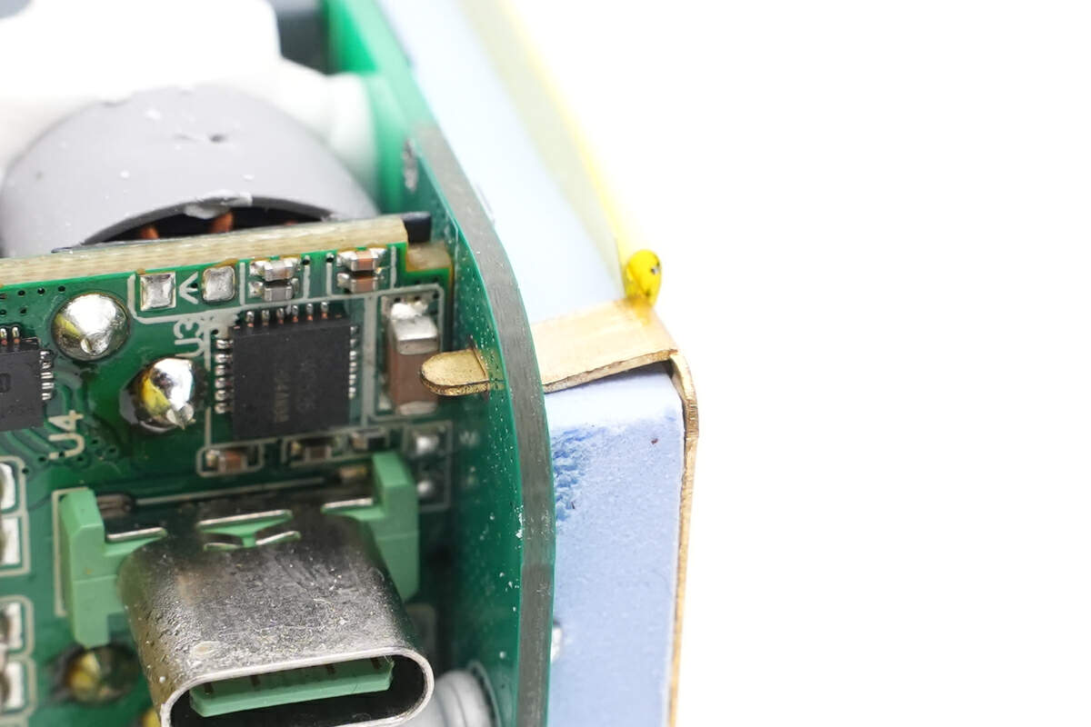 首先沿壳体接缝撬开侧面外壳,PCBA模块采用铜片散热,并粘贴胶带绝缘。