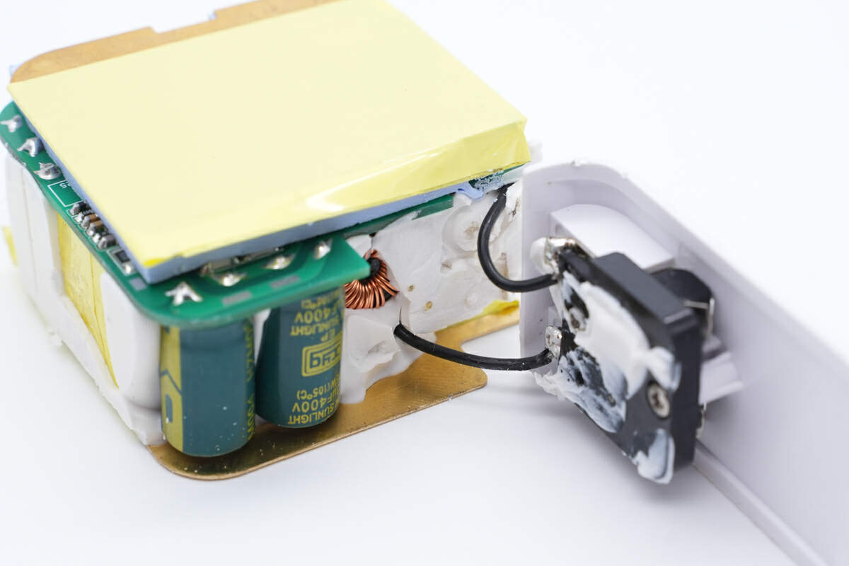 充电器输入端一览,元件被打胶填充,输入端焊接保险丝,共模电感,差模电感和高压滤波电容。