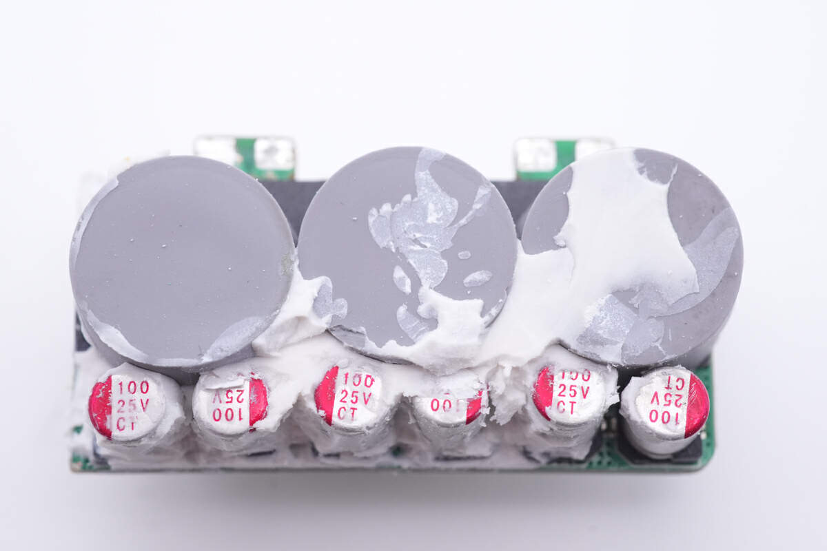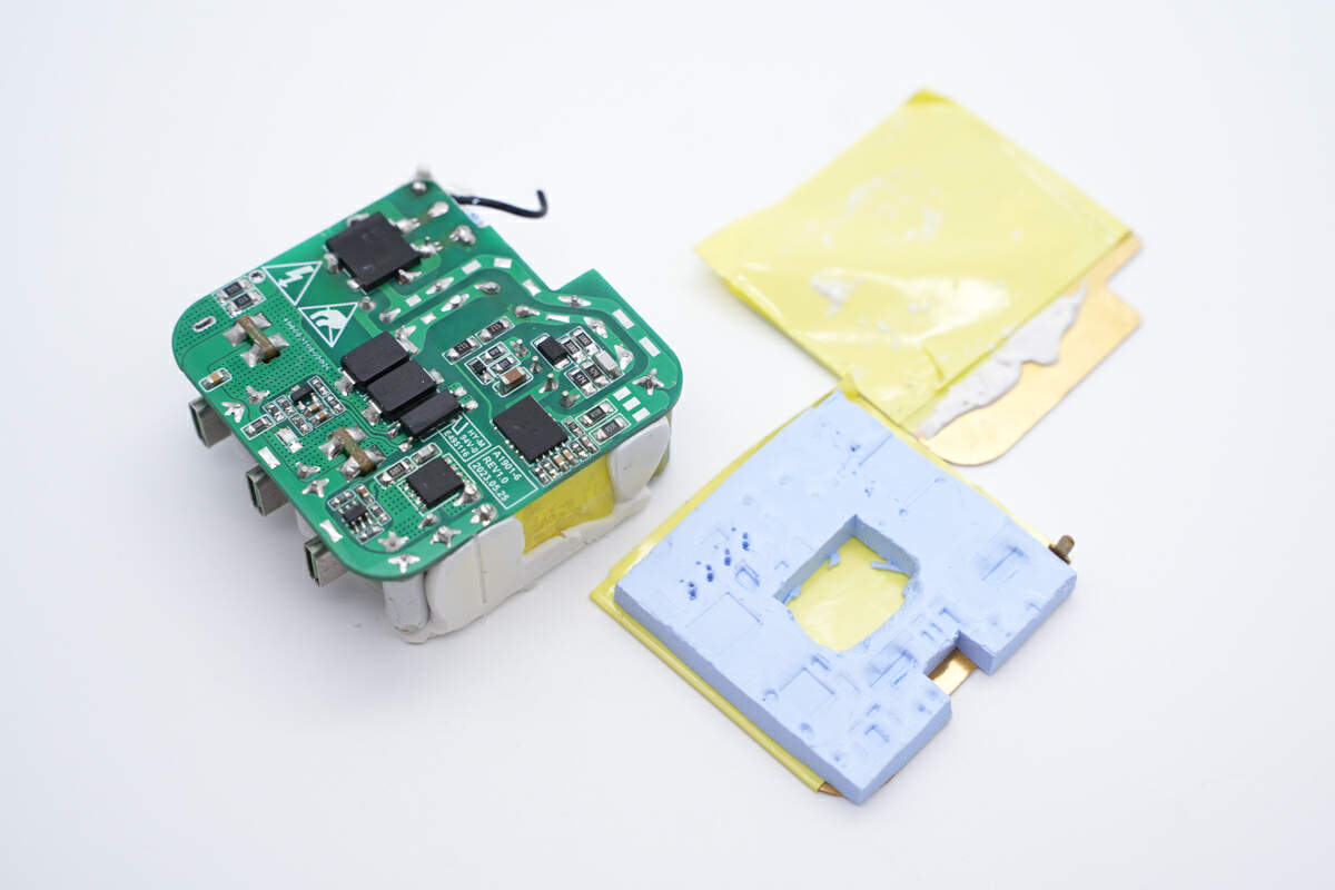取下PCBA模块反面正反面覆盖的散热片,导热垫对应贴片Y电容的位置镂空,降低厚度。
