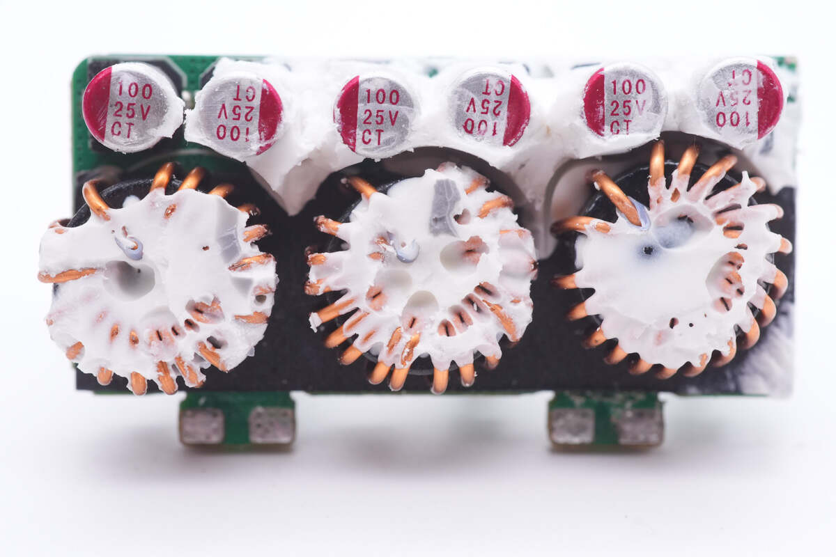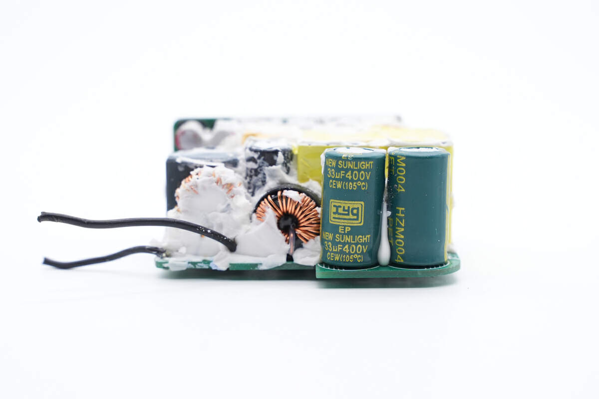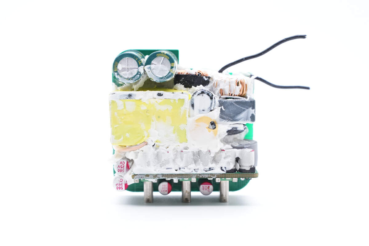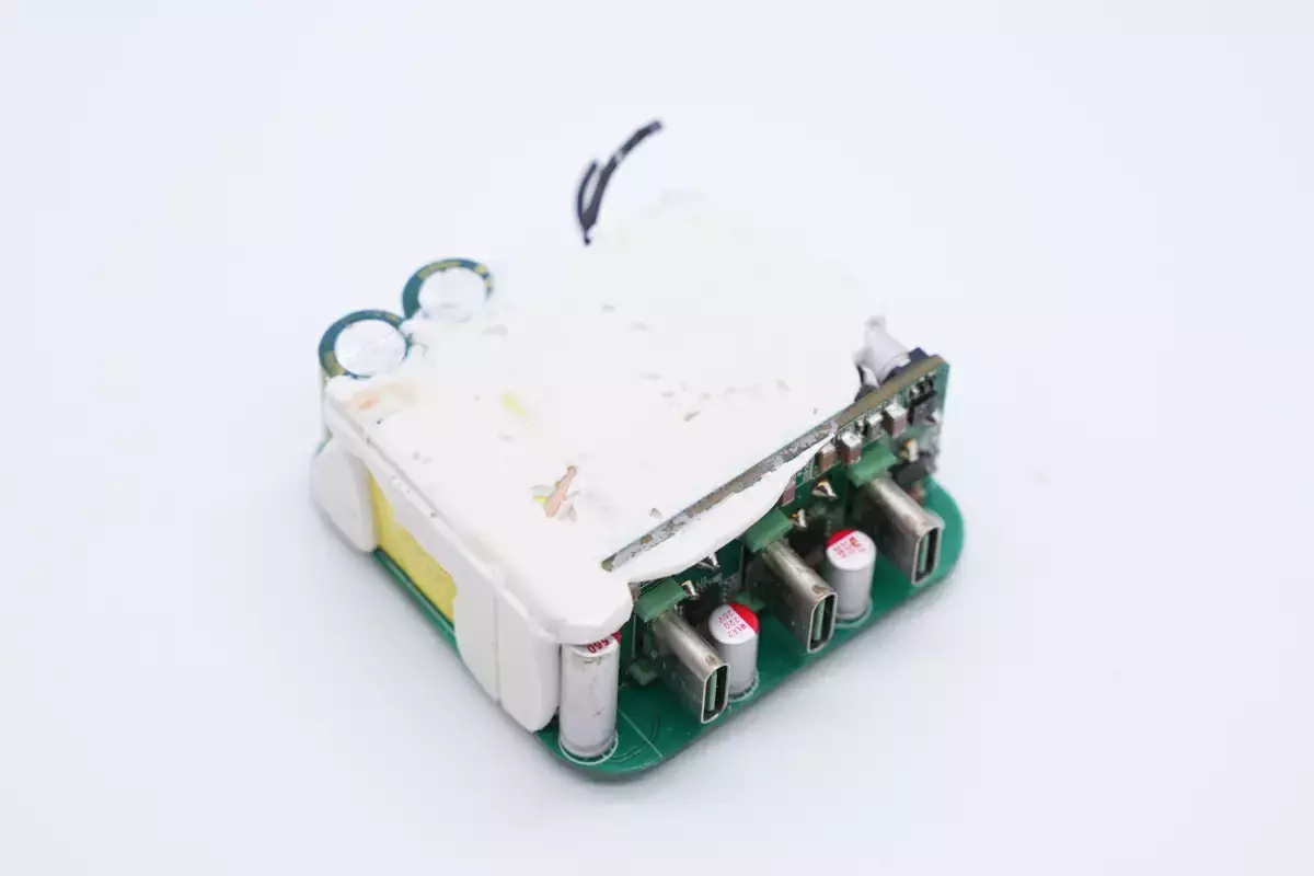 清理掉正面填充的胶水,PCBA模块右侧为保险丝和EMI滤波电路,左上角焊接两颗高压滤波电容,下方焊接变压器,底部为二次降压小板,焊接降压电路和USB母座。