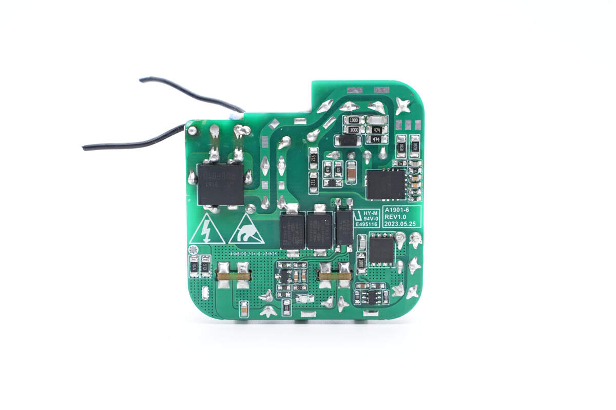 PCBA模块背面一览,左侧焊接一颗贴片整流桥,右侧焊接合封氮化镓芯片,贴片Y电容,反馈光耦,同步整流控制器和同步整流管。
