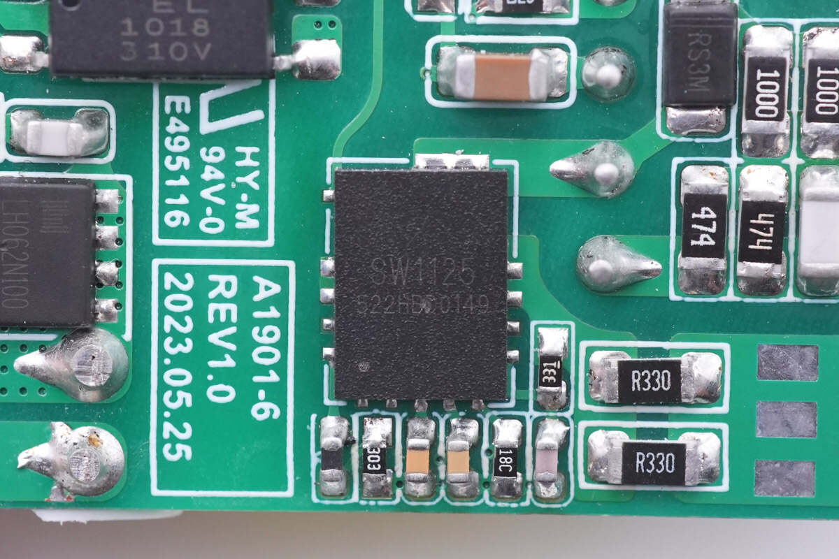 充电头网通过拆解了解到,这款充电器内置智融科技SW1125合封氮化镓芯片,这款芯片内部集成了氮化镓开关管和高频反激驱动器,还集成高压启动电路和X电容放电功能。芯片支持7-90V宽范围供电,在PD快充中应用,无需增加额外的供电绕组或者稳压电路,进一步简化应用。