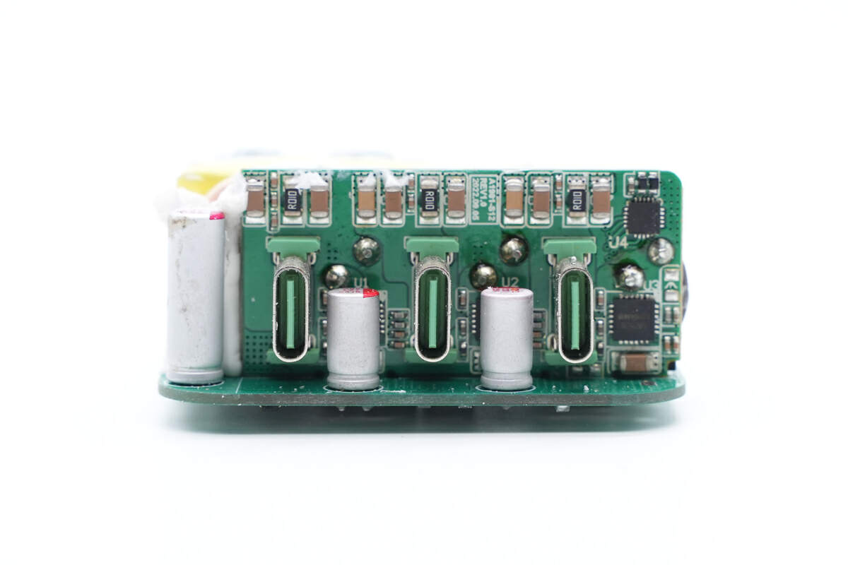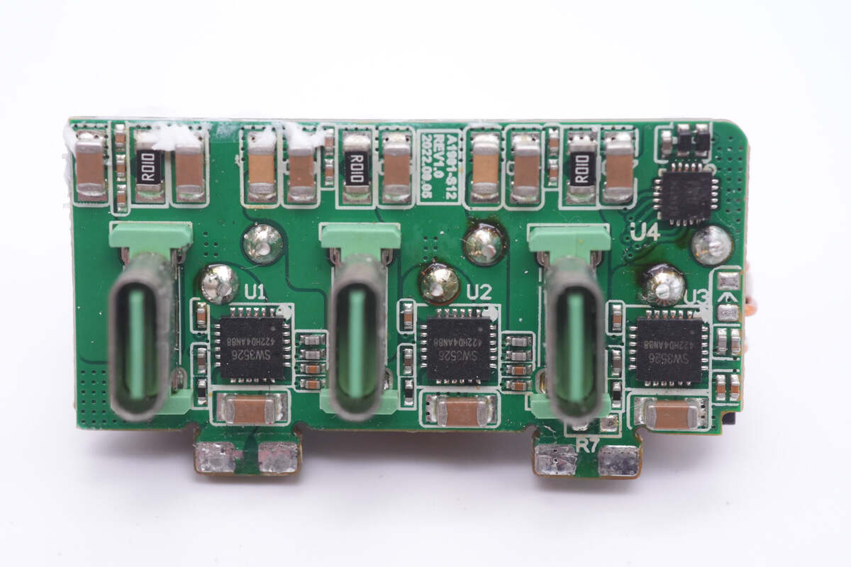同时内部还使用了SW1608同步整流控制器,搭配同步整流管组成固定电压输出的开关电源。三颗SW3526对应三个USB-C接口降压输出,SW3526内置降压开关管,外围元件精简。充电器内部芯片方案全部来自智融科技,实现了一站式PD快充芯片供应。