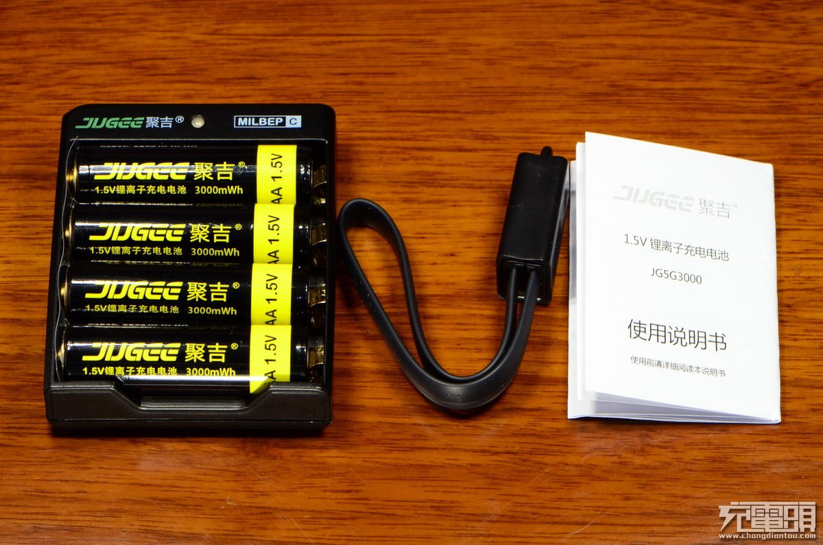 打开盒子,左侧是 USB-A to Micro USB 充电线,右侧是装有四节聚吉电池的充电器。