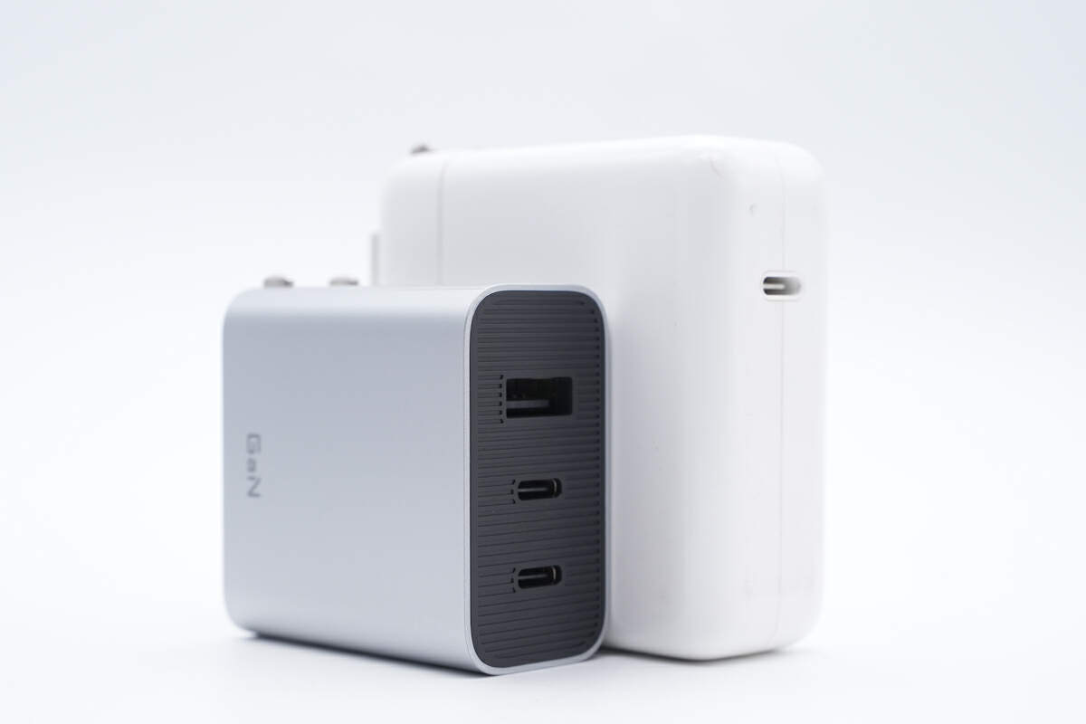 和苹果61W充电器进行大小对比,体积优势明显。