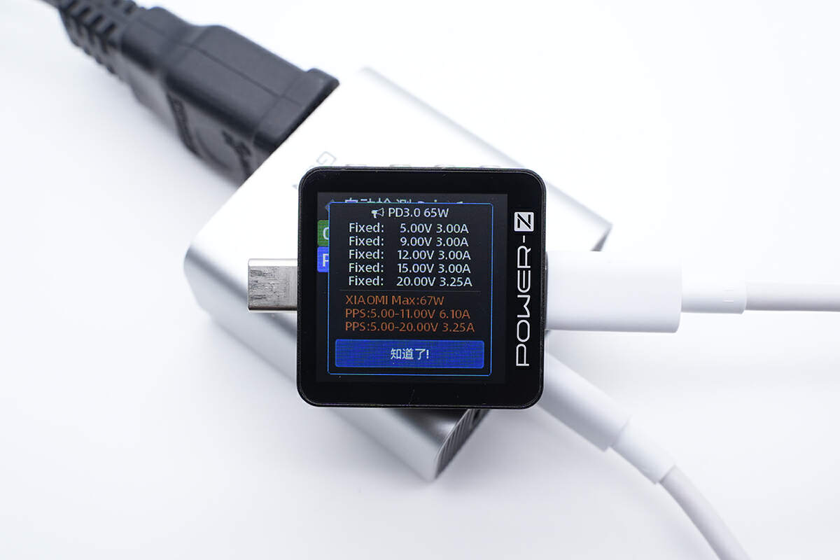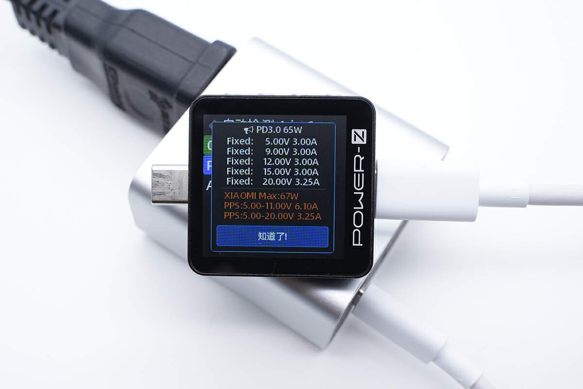 使用ChargerLAB POWER-Z KM003C测得USB-C1口支持QC3.0、PD3.0、DCP、Apple 2.4A充电协议,还测出了小米67W私有快充。