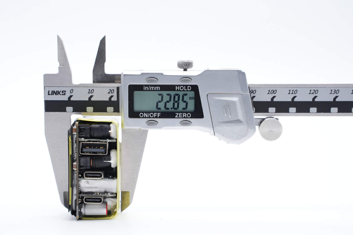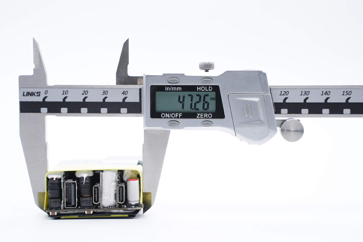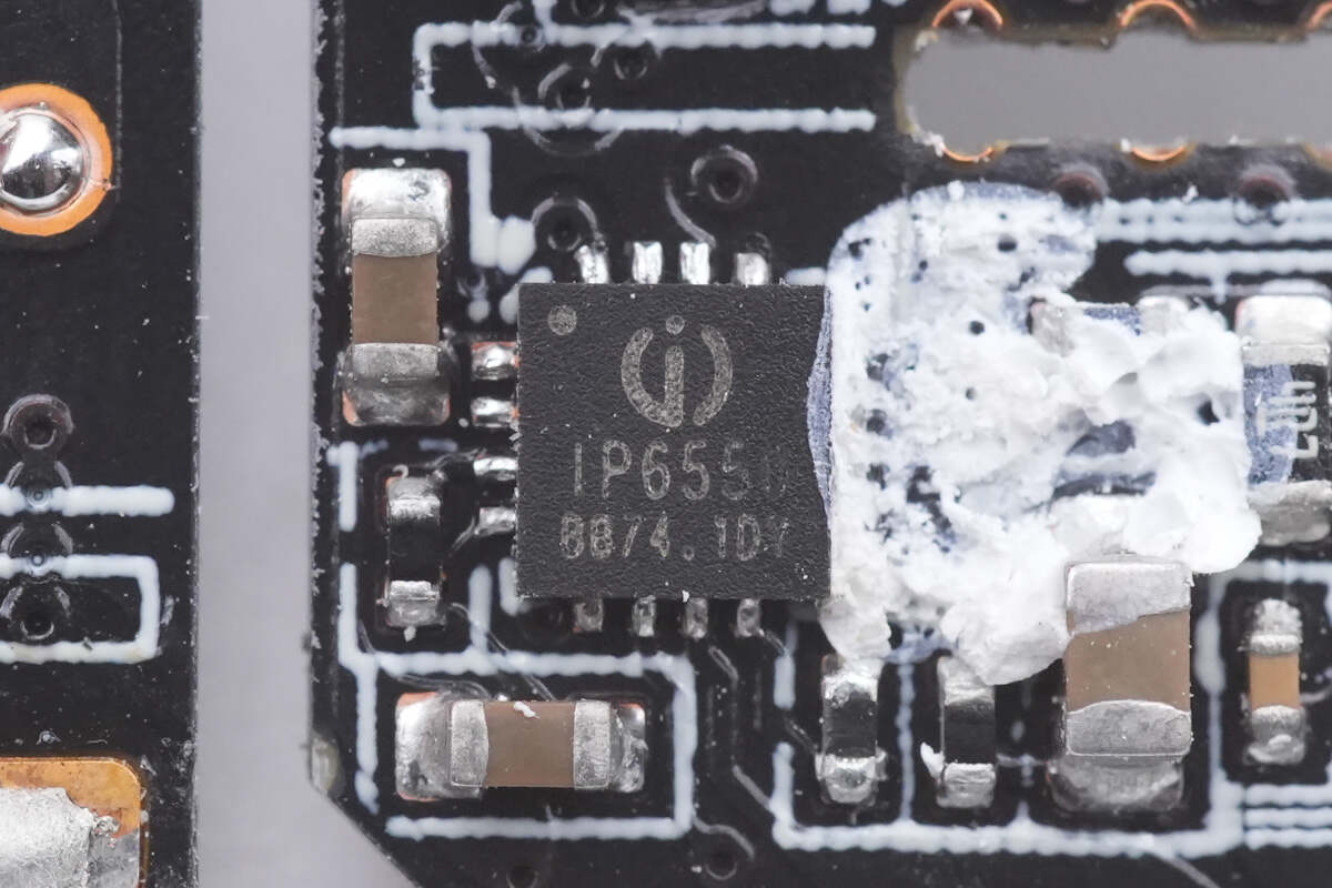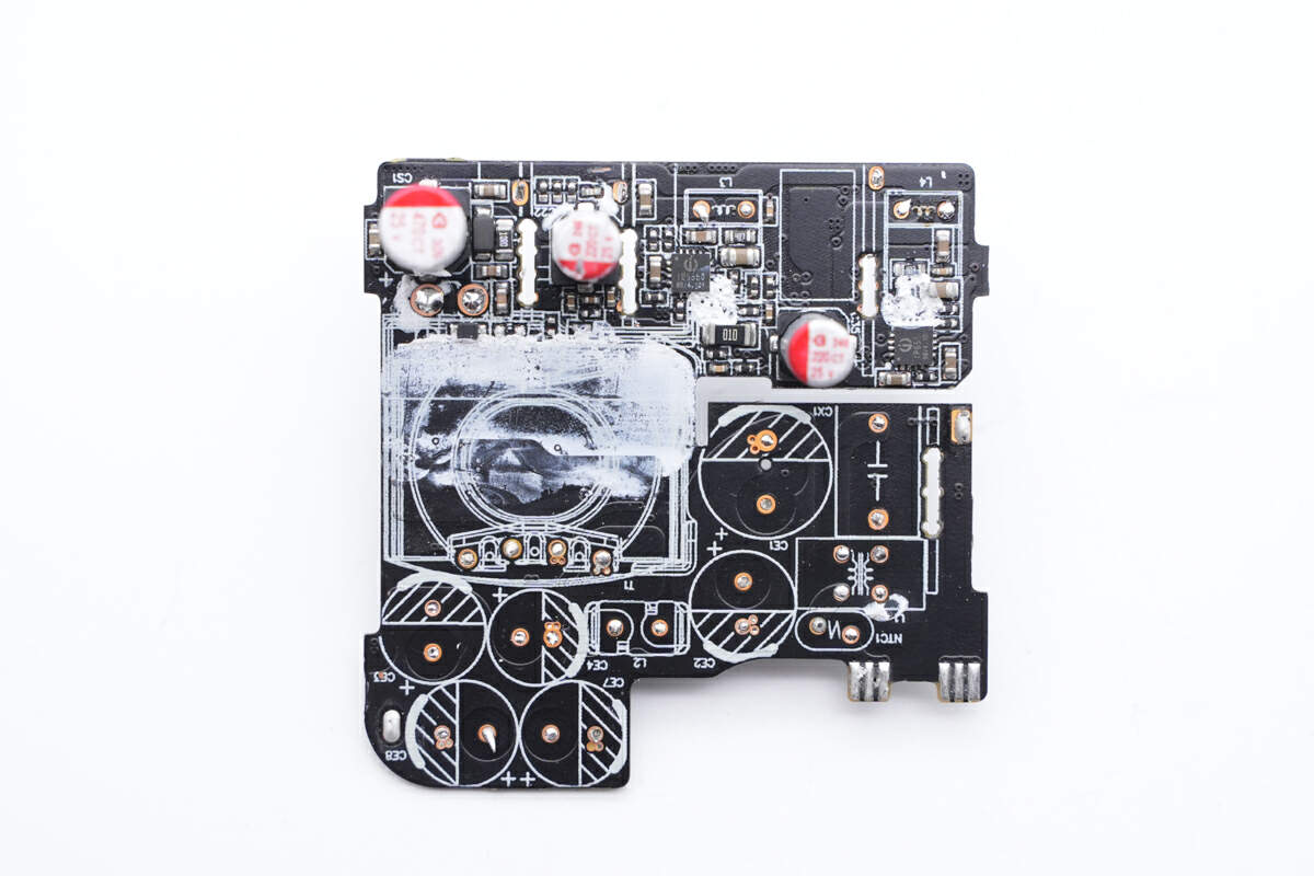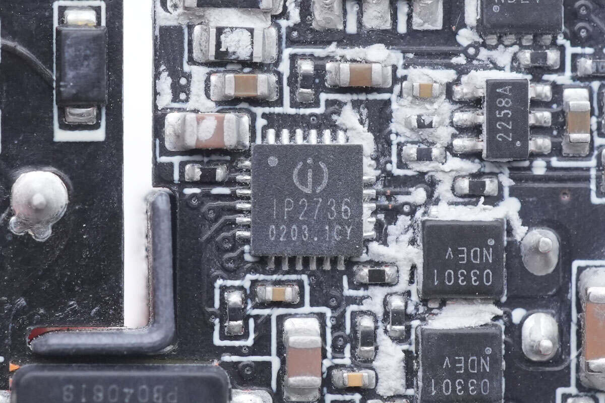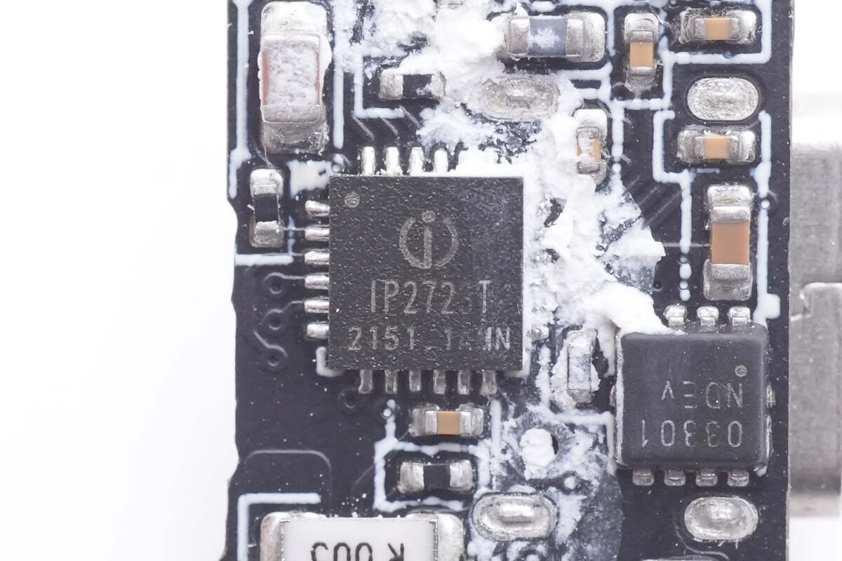 输出采用英集芯IP2723T协议芯片和IP2736T两颗协议芯片搭配IP6550同步降压控制器,实现三个接口的降压快充输出,并配有热敏电阻进行过热检测。充电器内部初级滤波电容来自艾华,次级固态电容来自绿宝石。内部采用多块小板组合焊接,内部空间紧凑,用料可靠。