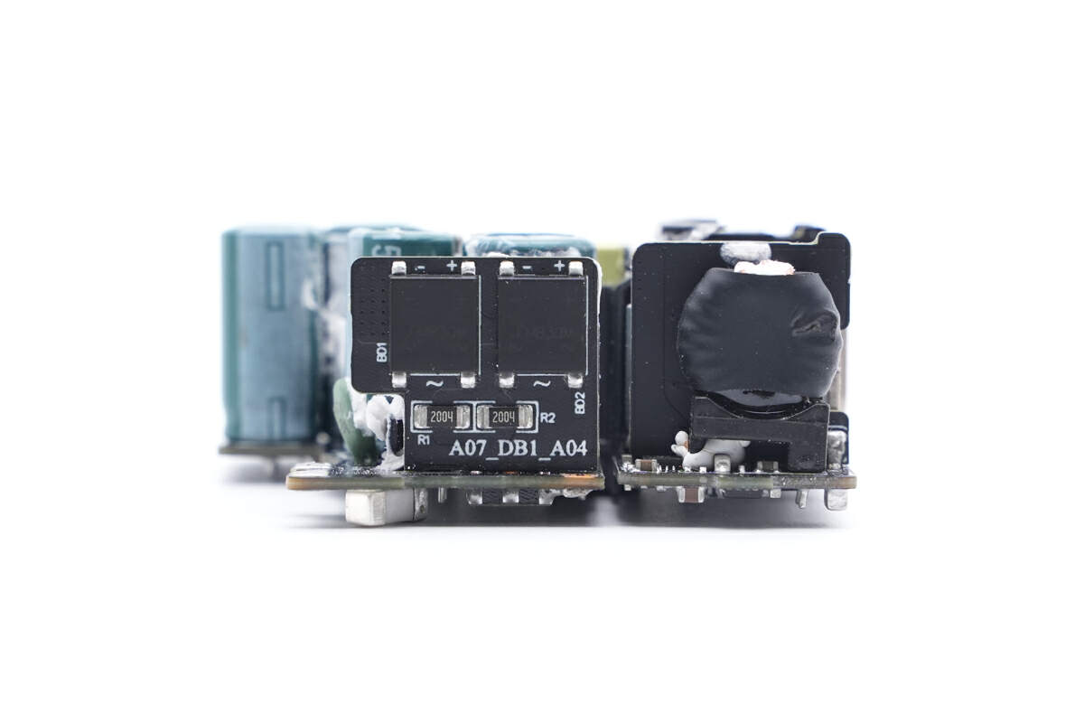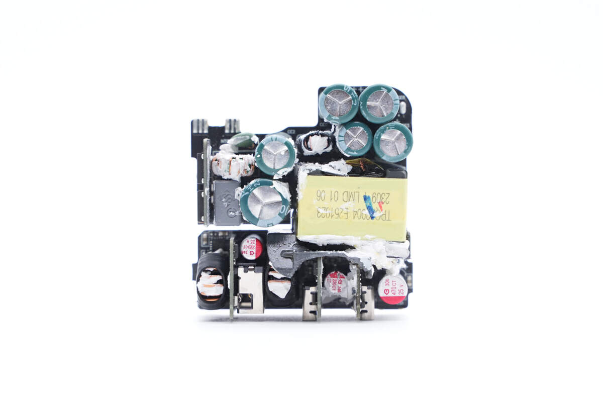 PCBA模块正面一览,其中左侧为输入EMI滤波电路和整流桥,右侧为高压滤波电容,在电容下方是开关变压器,底部为输出降压电路,焊接USB母座,降压电感和滤波电容。