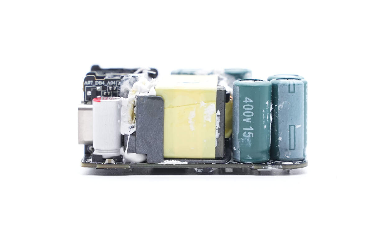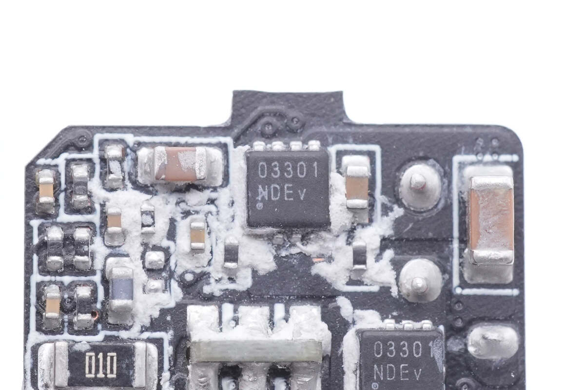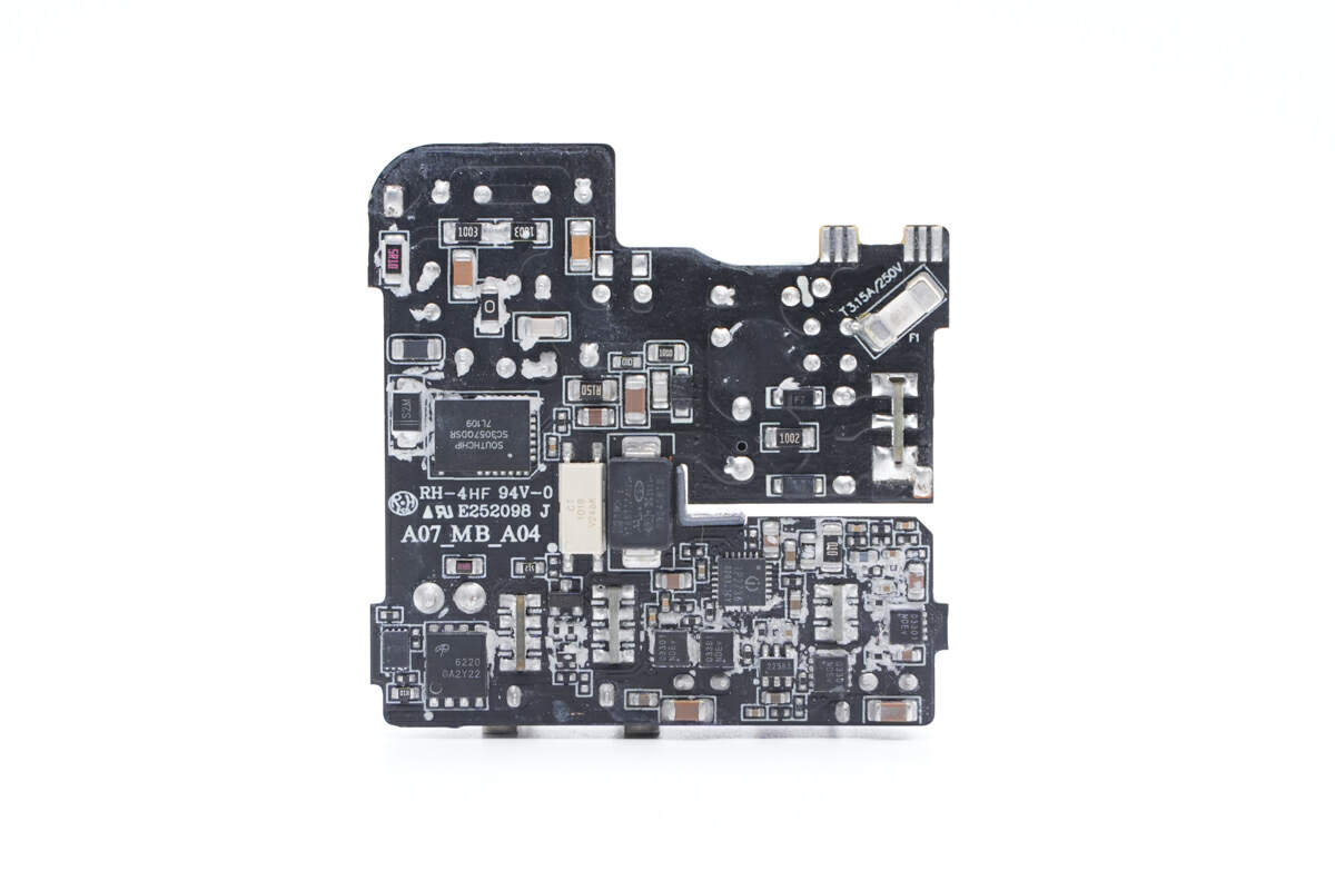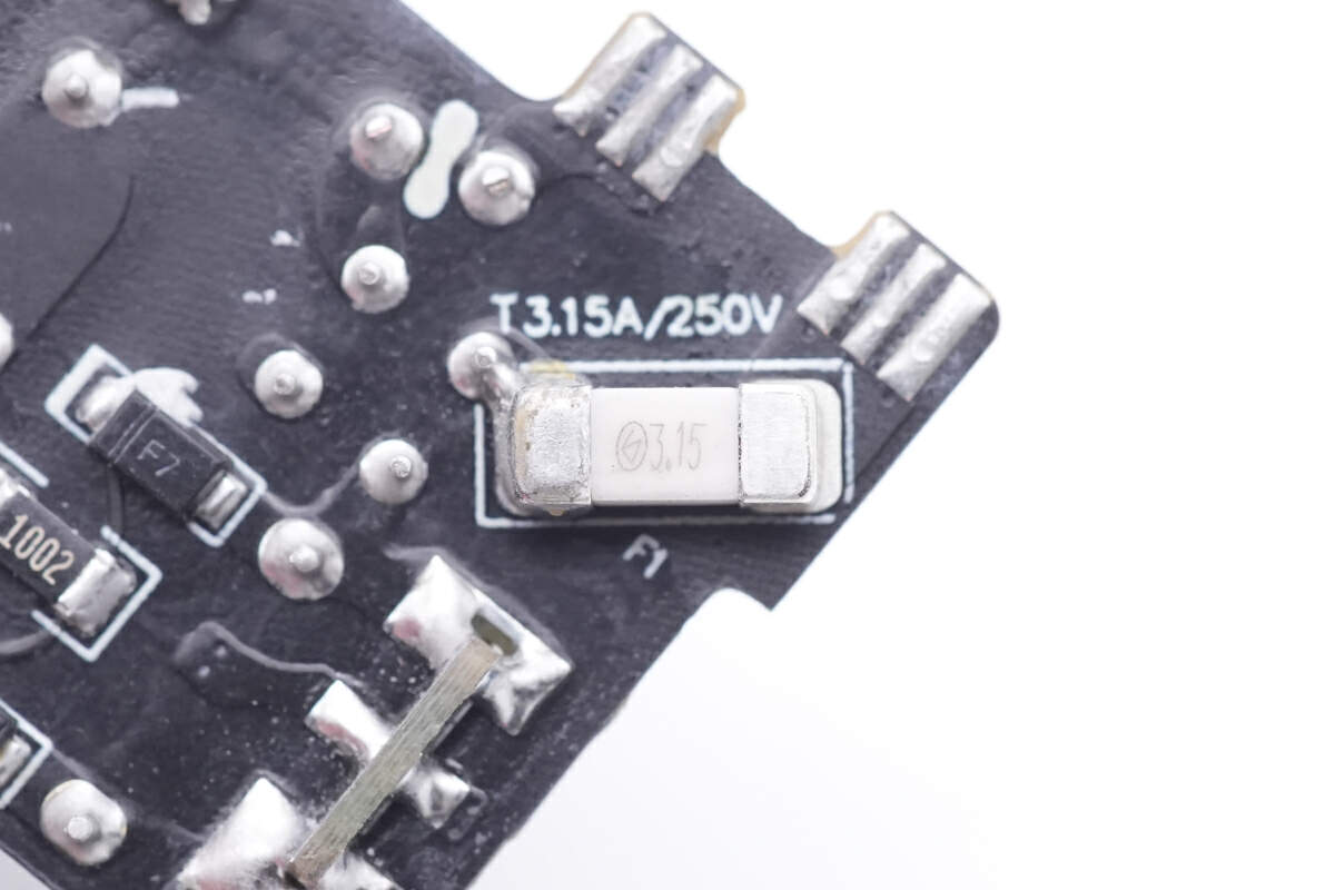 背面焊接保险丝,氮化镓合封芯片,反馈光耦,贴片Y电容,同步整流控制器,同步整流管,协议芯片和降压开关管。