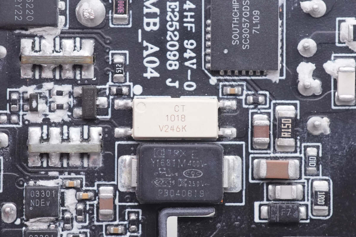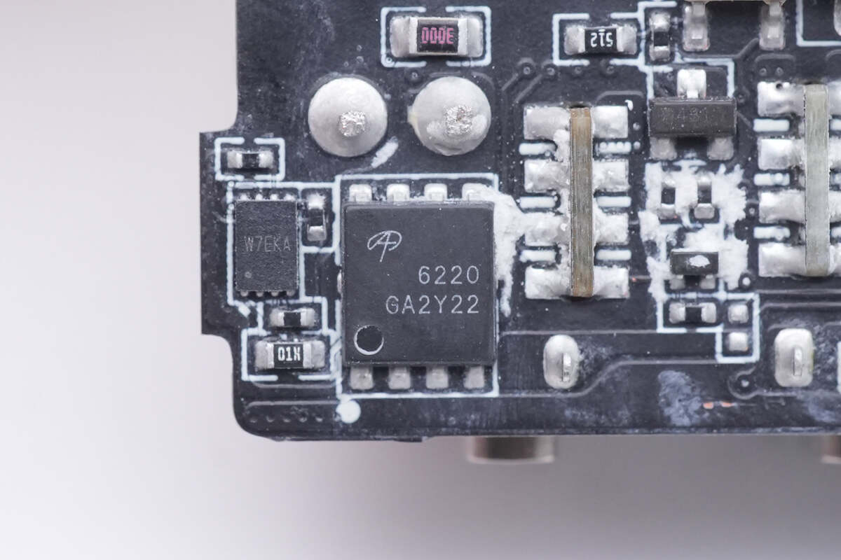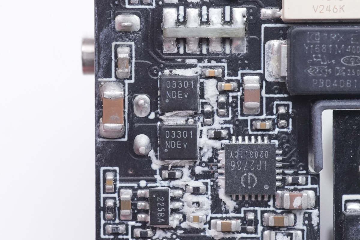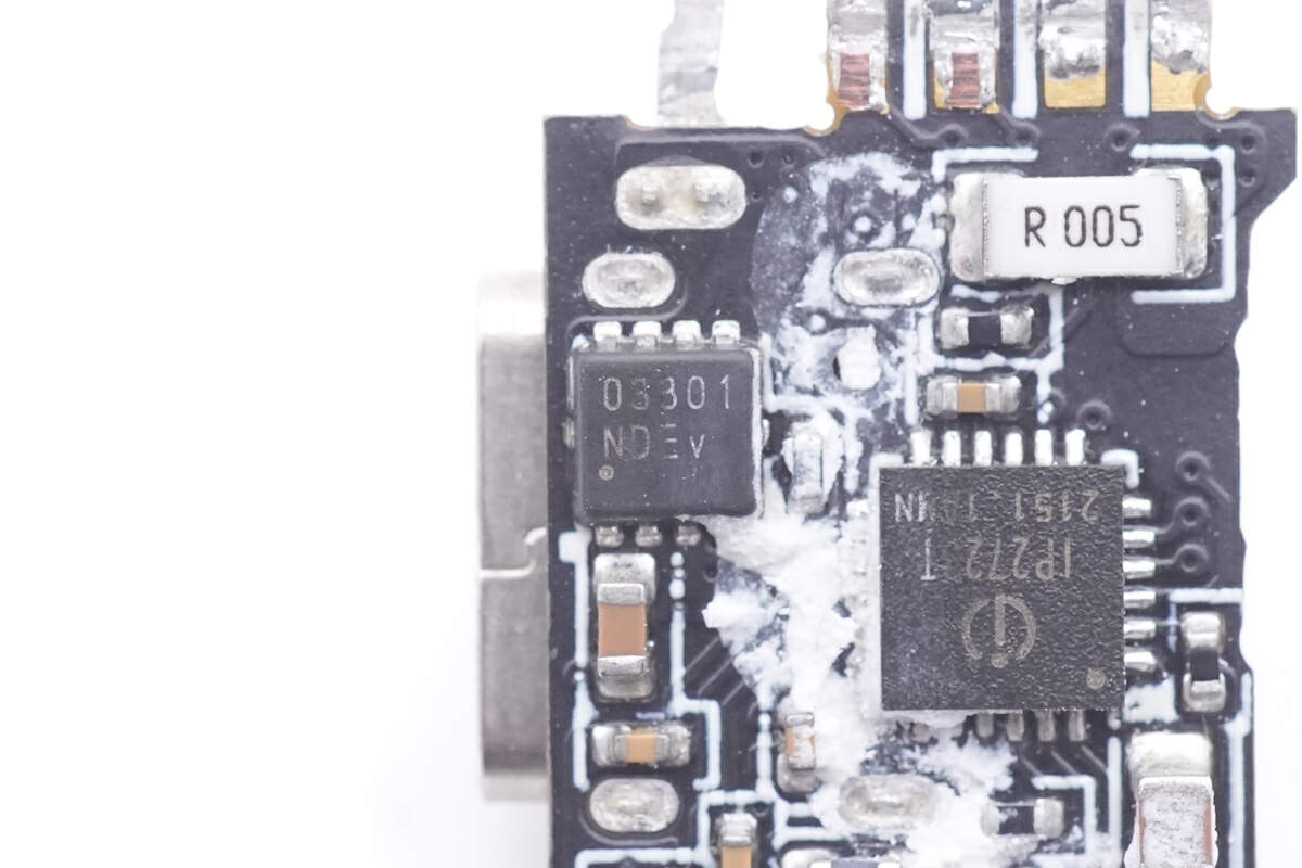 背面焊接保险丝,氮化镓合封芯片,反馈光耦,贴片Y电容,同步整流控制器,同步整流管,协议芯片和降压开关管。