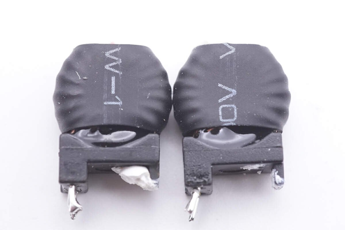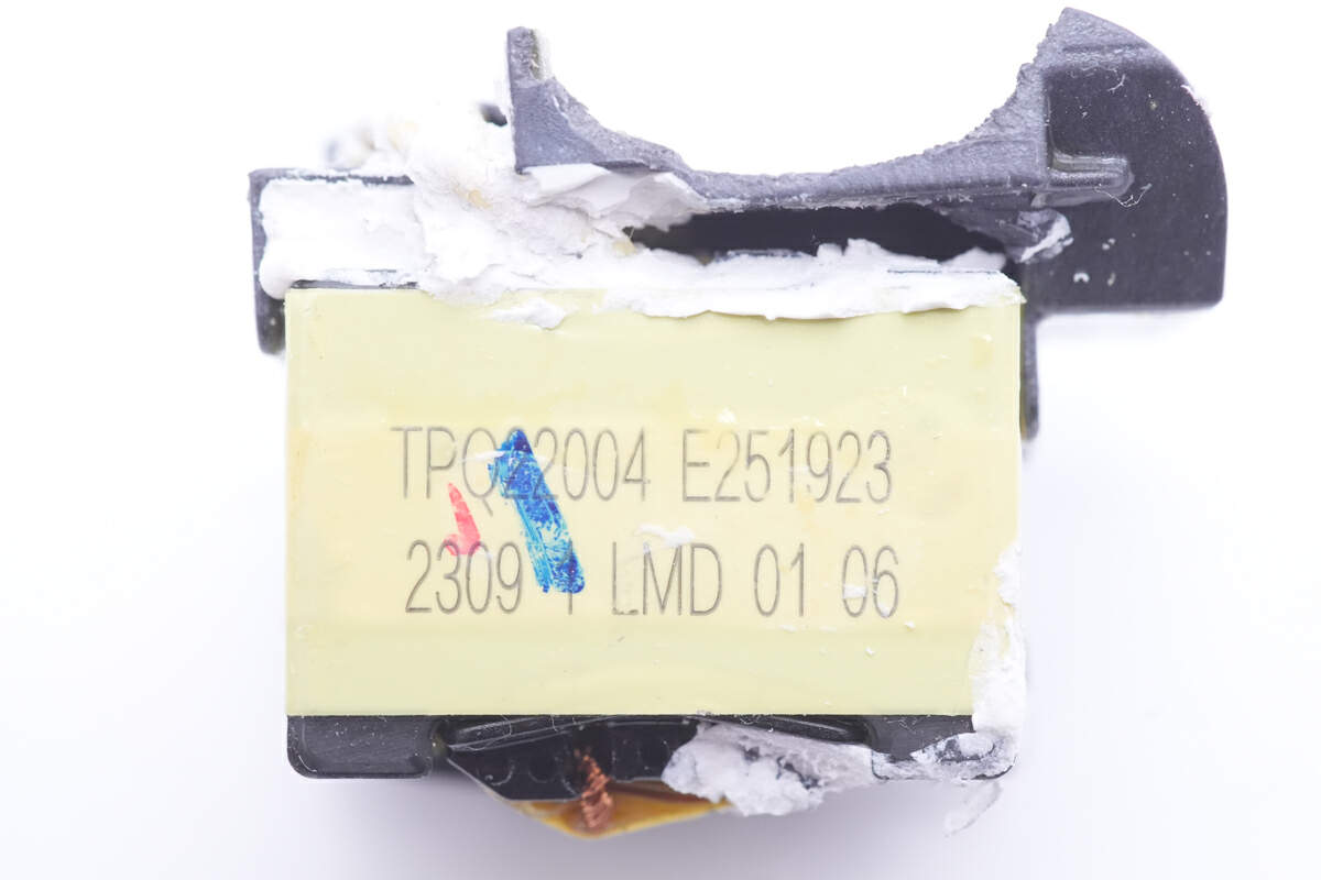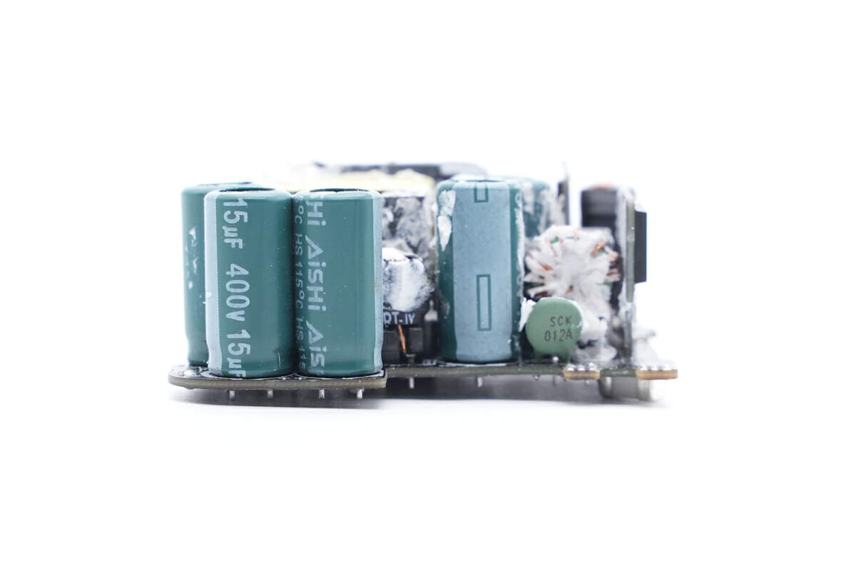 PCBA模块正面,可以看到高压滤波电解电容等器件打胶加固,变压器顶面涂有白胶,侧边小板贴有蓝色导热垫帮助导热,初次级间设有塑料隔离板。
