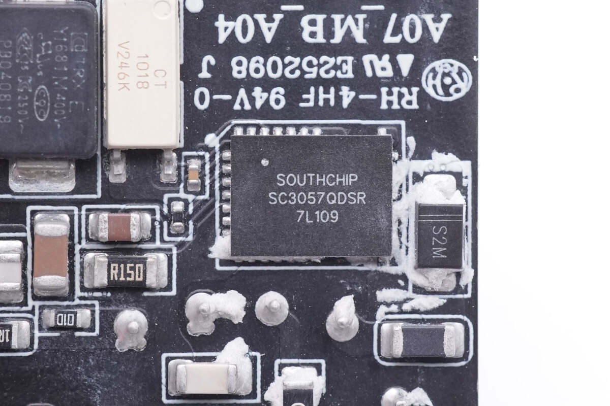 充电器初级主控芯片来自南芯科技,采用SC3057合封氮化镓芯片,这颗芯片将高性能多模式反激控制器、氮化镓驱动、氮化镓开关管、供电和保护等电路集成在一颗散热增强的QFN6*8封装内部。通过合封来简化外部元件数量,并消除传统驱动走线寄生参数对高频开关的影响。