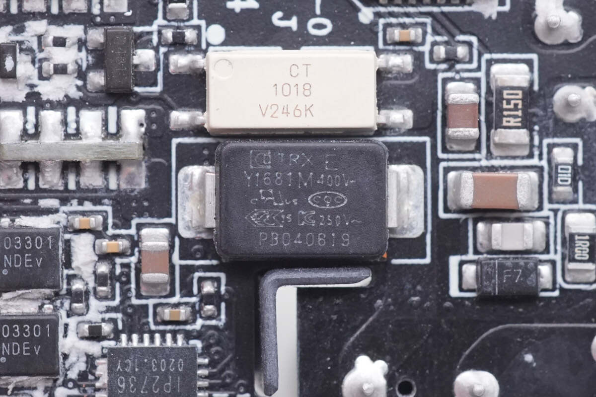 通过对充电器PCBA模块的观察发现,这款充电器采用反激开关电源设计,同步整流,固定电压输出。输出通过两路独立的降压电路,由协议芯片控制降压转换器调节输出电压,并进行功率自动分配。下面我们就从输入端开始了解各个元器件的信息。