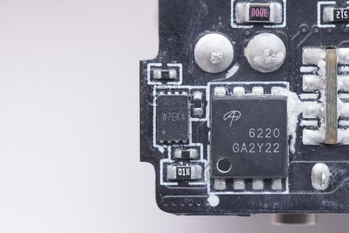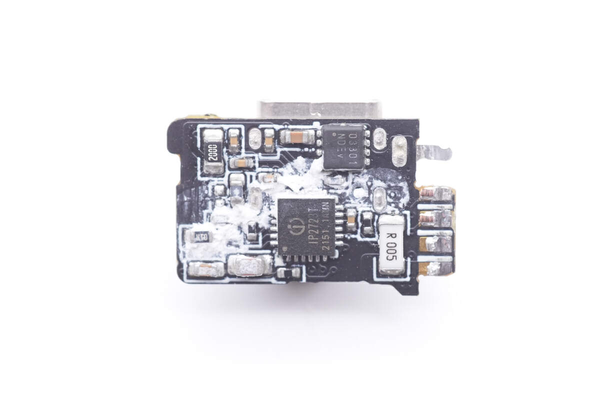 将小板以及正面其它器件拆掉,可以看到USB-C2和USB-A口旁各有一颗同步降压控制器,即这两个接口各配有独立的二次降压独立。