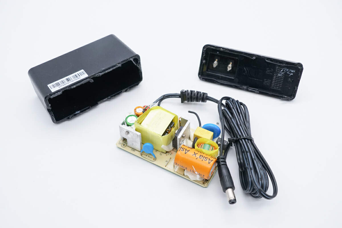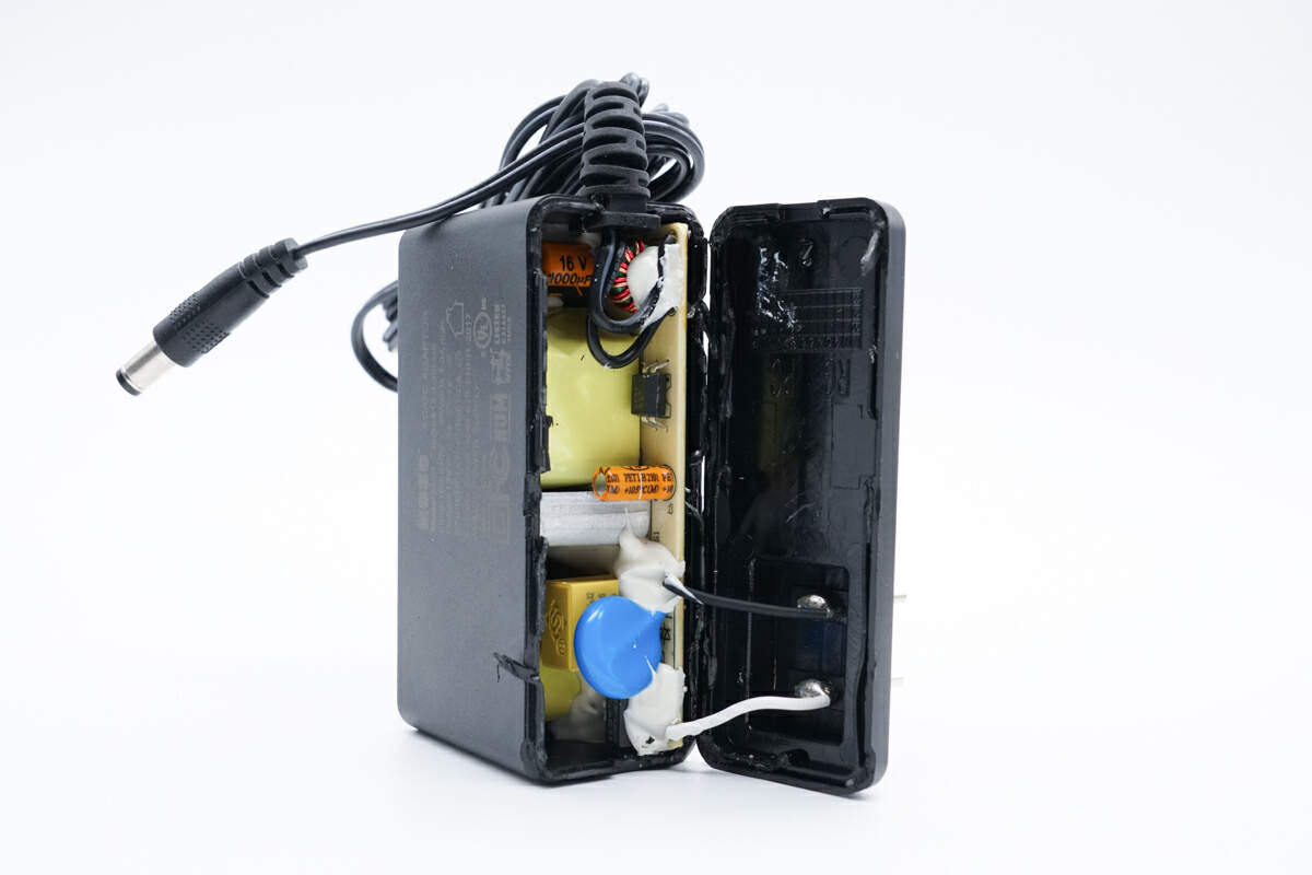 首先沿接缝拆开外壳,交流输入和直流输出通过导线焊接连接到PCBA模块供电,输入输出线均打胶加固。
