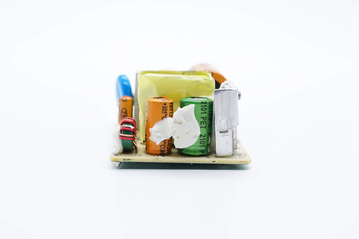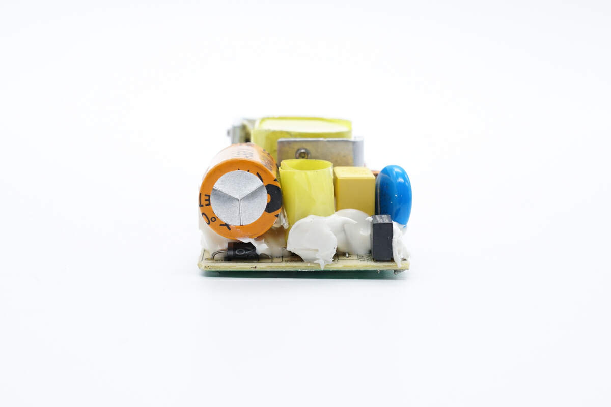 PCBA模块正面一览,左侧焊接输入保险丝,压敏电阻,共模电感,安规X2电容,NTC浪涌抑制电阻和高压滤波电容。右侧为开关管,变压器,输出整流管,滤波电容和滤波电感等元件。