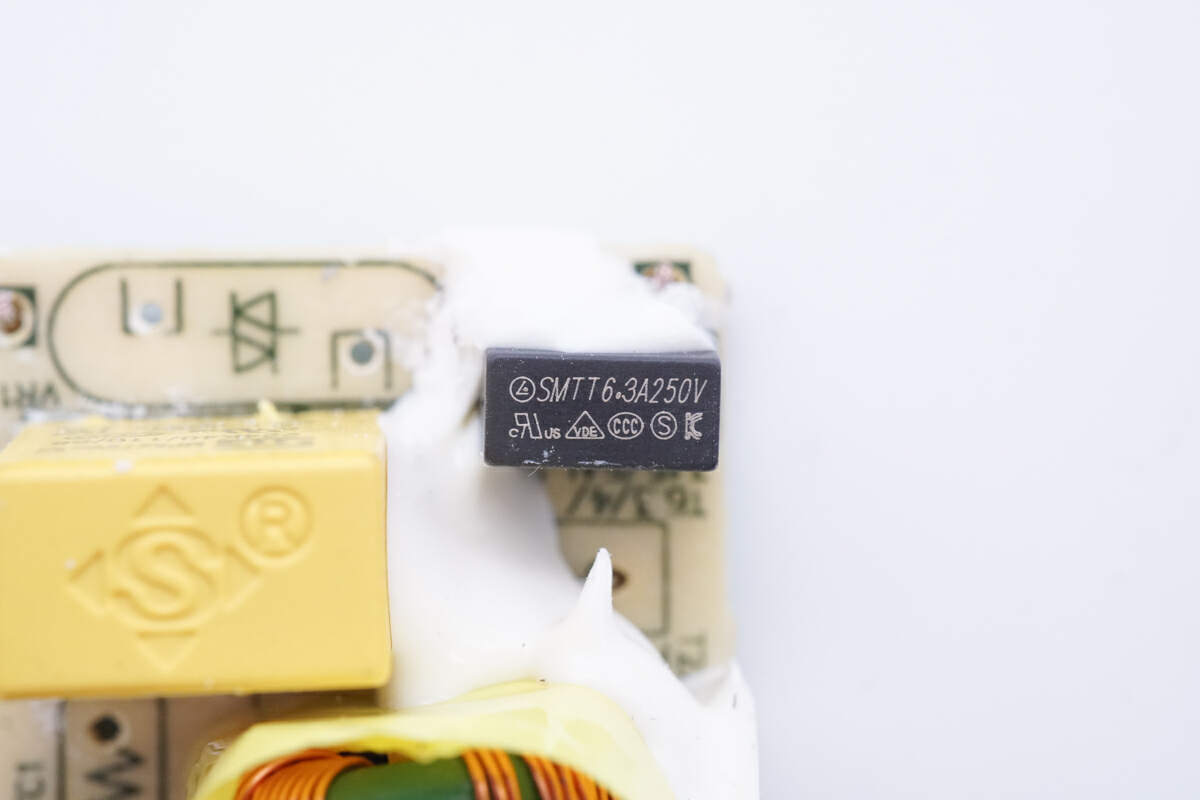 输入端侧面一览,元件均打胶加固,在高压电解电容底部焊接整流二极管。