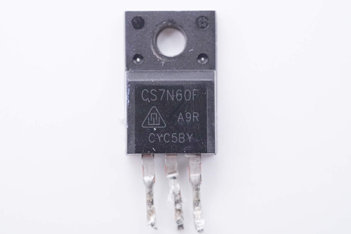 初级开关管来自华润微,型号CS7N60FA9R,是一颗耐压600V的NMOS,导阻1Ω,采用TO220F绝缘封装。