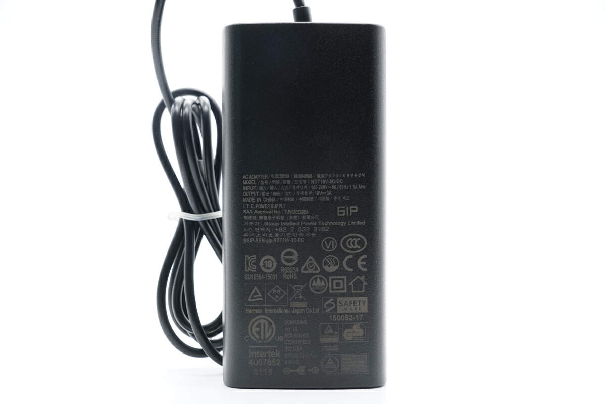 JBL这款适配器为黑色长条机身设计,输入为八字线插座,支持全球宽电压输入。输出为19V3A,输出功率为57W,自带1.25米长DC输出线,适配旗下的音箱供电。