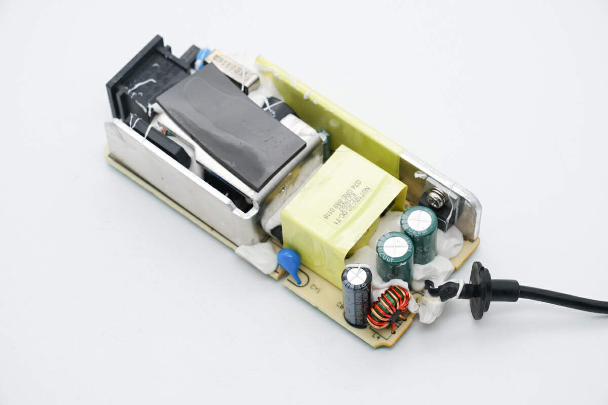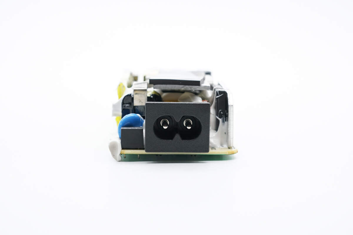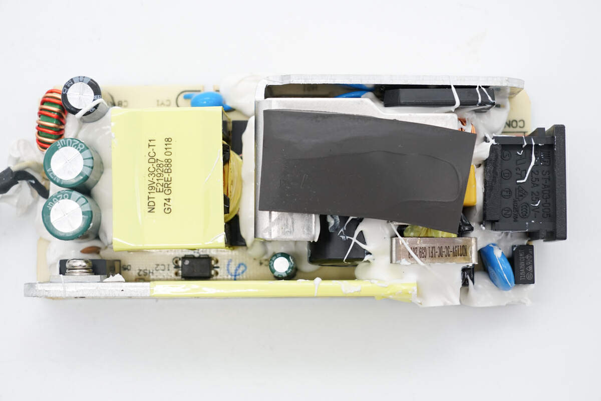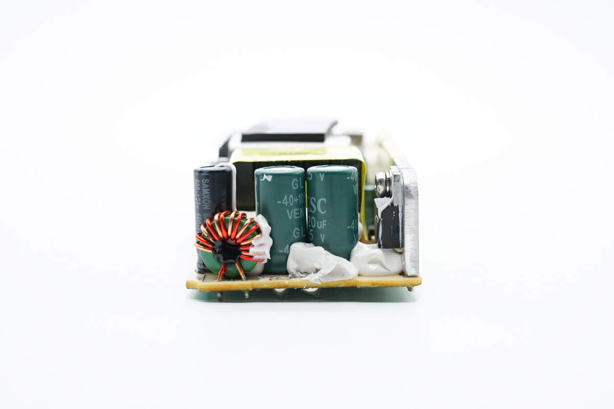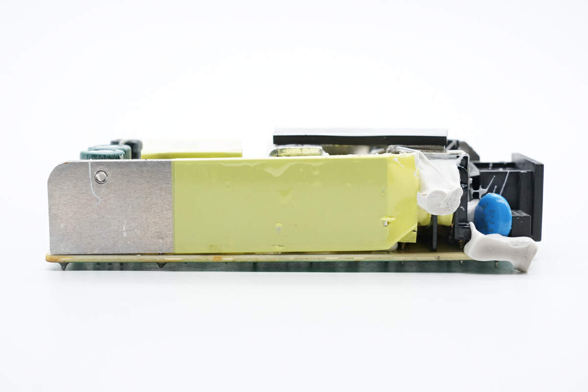 PCBA模块正面一览,右侧为电源输入,焊接输入插座,保险丝,压敏电阻,共模电感,安规X2电容,整流桥和高压滤波电容。左侧为变压器,输出滤波电容及滤波电感,下方为整流管的散热片。