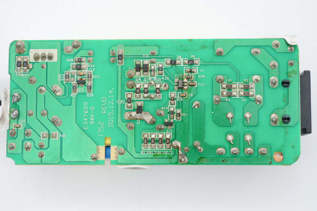 PCBA模块背面焊接一颗初级电源芯片。电源适配器为反激架构,定压输出,输出电压通过光耦反馈,采用肖特基二极管整流。下面我们就从输入端开始一一了解各个元器件的信息。