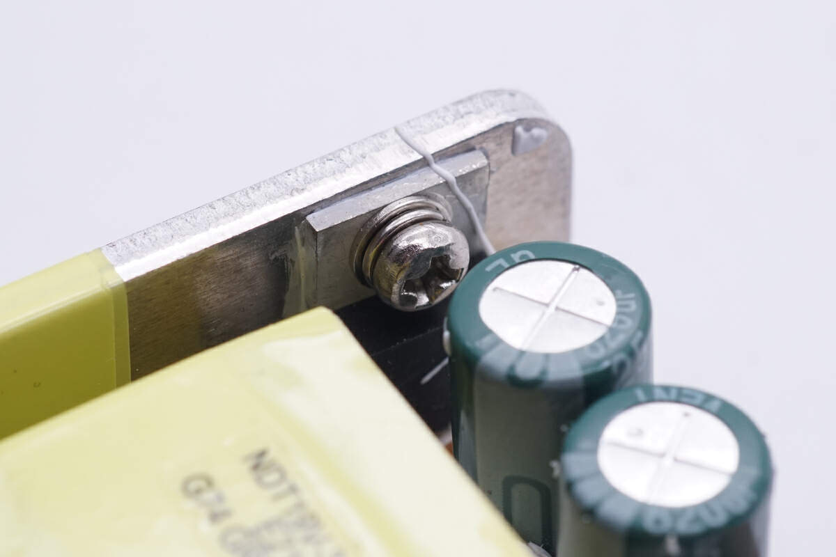 初级开关管和输出整流管均配有散热片,初级开关管的散热片贴有导热垫,次级整流管散热片缠绕胶带绝缘。