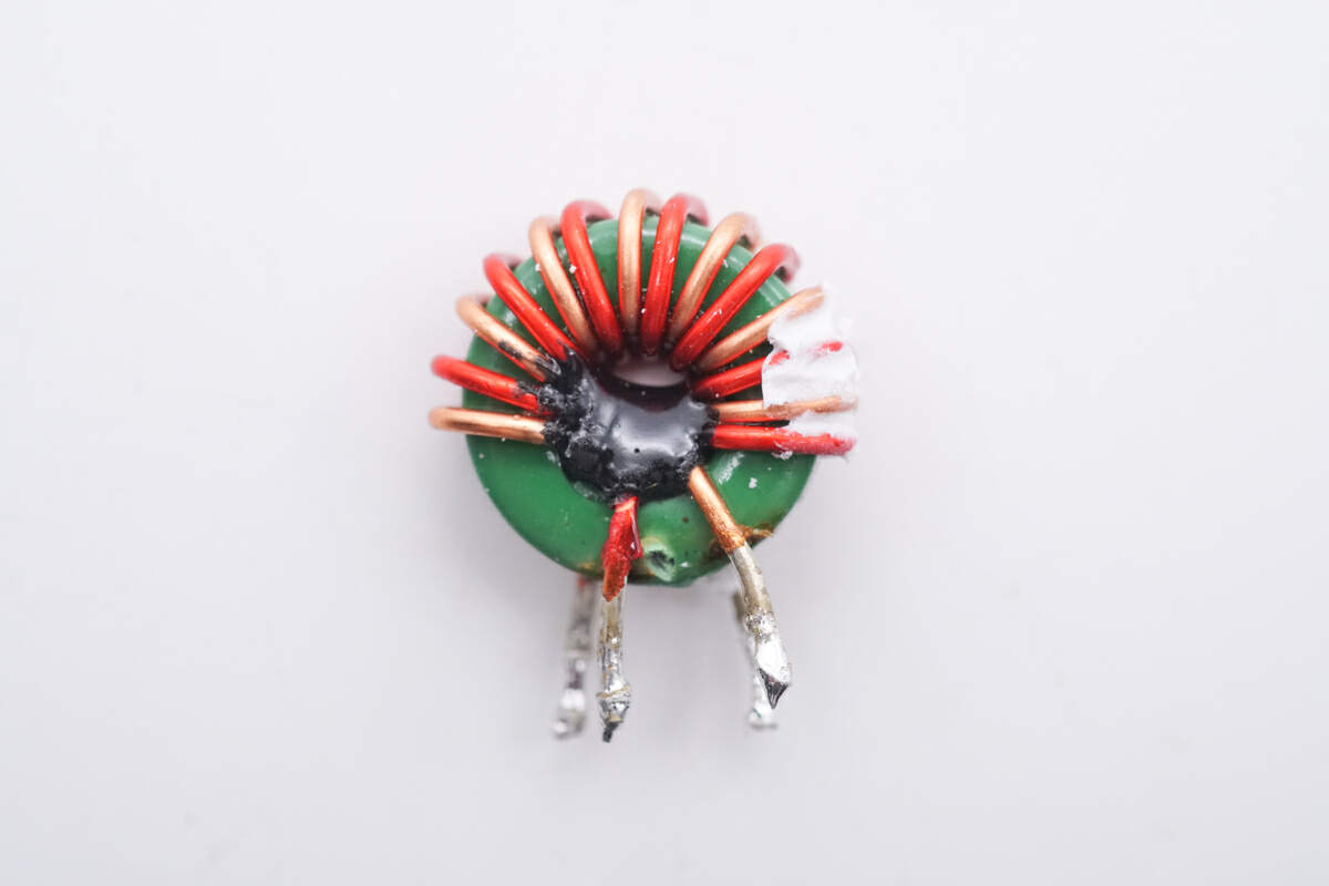 第一级共模电感采用绝缘骨架绕制,磁芯采用钢片加持固定。