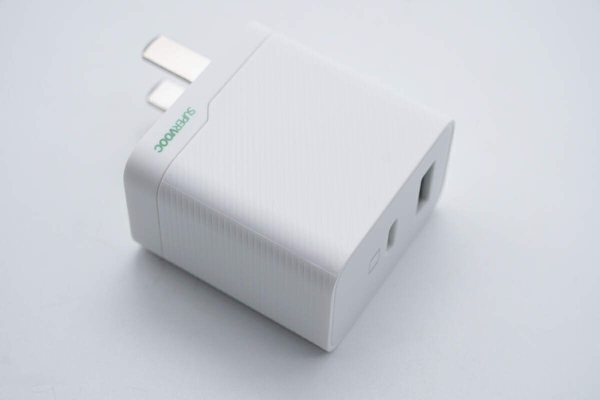 充电器采用经典直板造型,采用PC防火材质白色外壳,腰身做了斜纹理设计,手感独特。正面印有OPPO知名的绿色主题色SUPERVOOC标志。