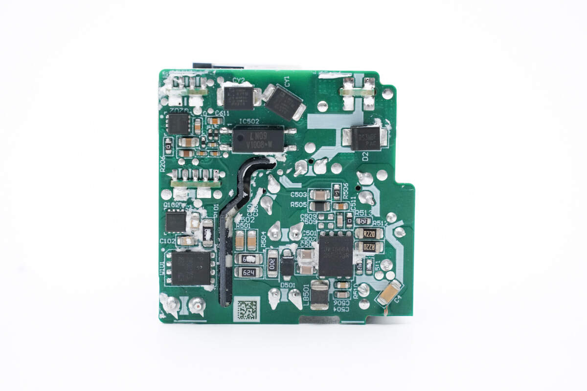 PCBA模块背面焊接整流二极管,氮化镓合封芯片,贴片Y电容,反馈光耦。左侧焊接同步整流管和两颗VBUS开关管。