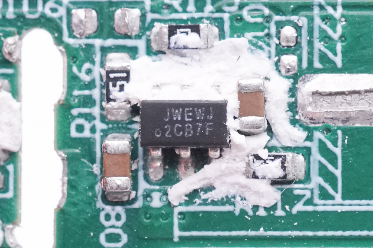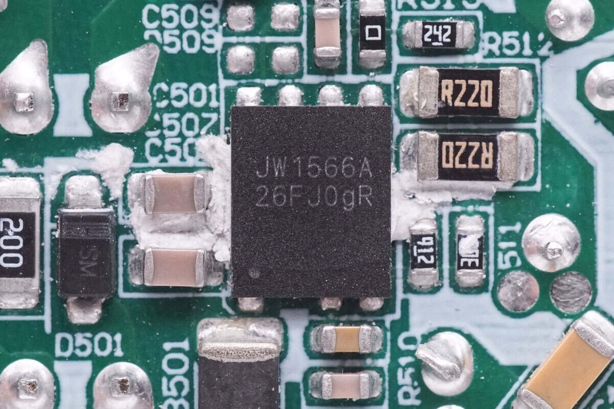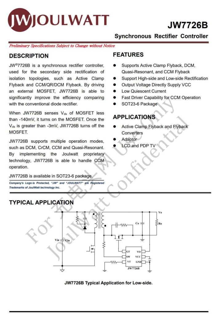 同步整流控制器来自杰华特,丝印JWEWJ,型号JW7726B,支持CCM、DCM、QR和ACF模式,在振铃期间能有效防止同步整流MOSFET的误开通;具有快速关断能力以便能兼容CCM;在启动过程中(VCC建立之前)能有效防止门极gate被耦合至开启电压,支持高侧和低侧同步整流应用,使用灵活。