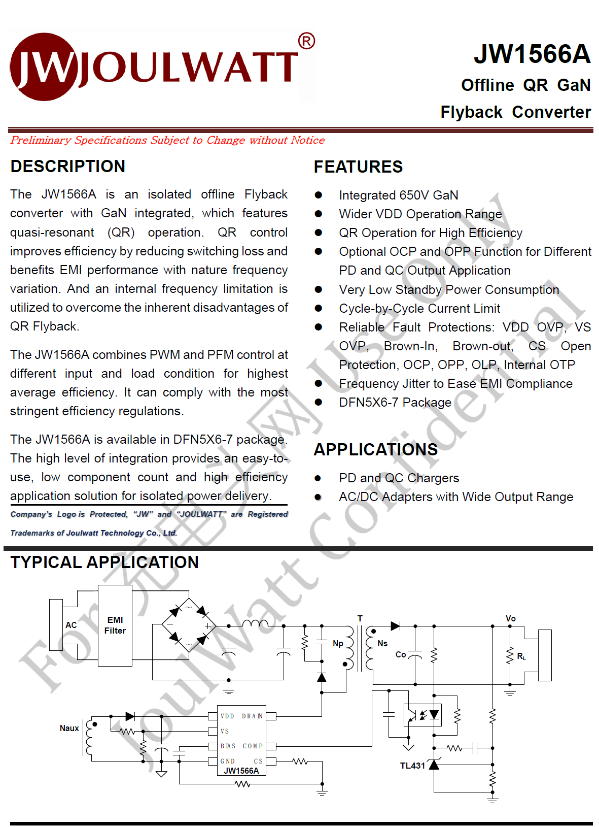 JW1566A内置650V耐压,480mΩ氮化镓开关管,芯片供电电压最高支持90V,最高开关频率可达170kHz,内置高压启动电路,具有超低的待机功耗。