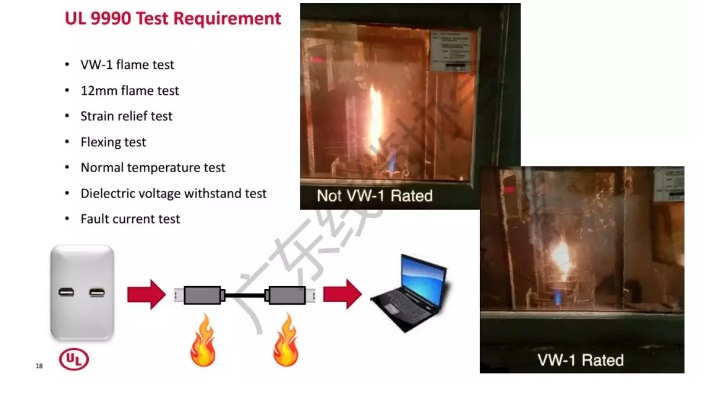 针对于Typoe-C线缆的UL 9990认证包括VW-1火焰测试、12mm火焰测试、电源线拉力测试、弯曲测试、标准温度测试、绝缘耐压试验、故障电流测试等七项测试。