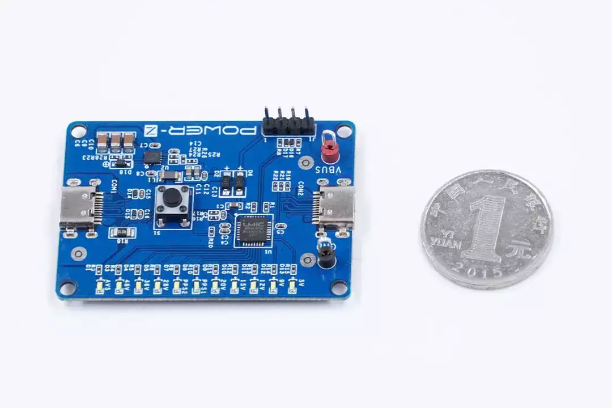 正面设有11颗LED指示灯,用来表示申请的电压档(FIXED、PPS、EPR和AVS档)。一个按钮开关,用来手动切换各个PDO,让USB PD供电设备输出设定的电压值。输入输出端均采用Type-C接口传输,并在输出端有正负极接线柱,便于负载链接带载测试。