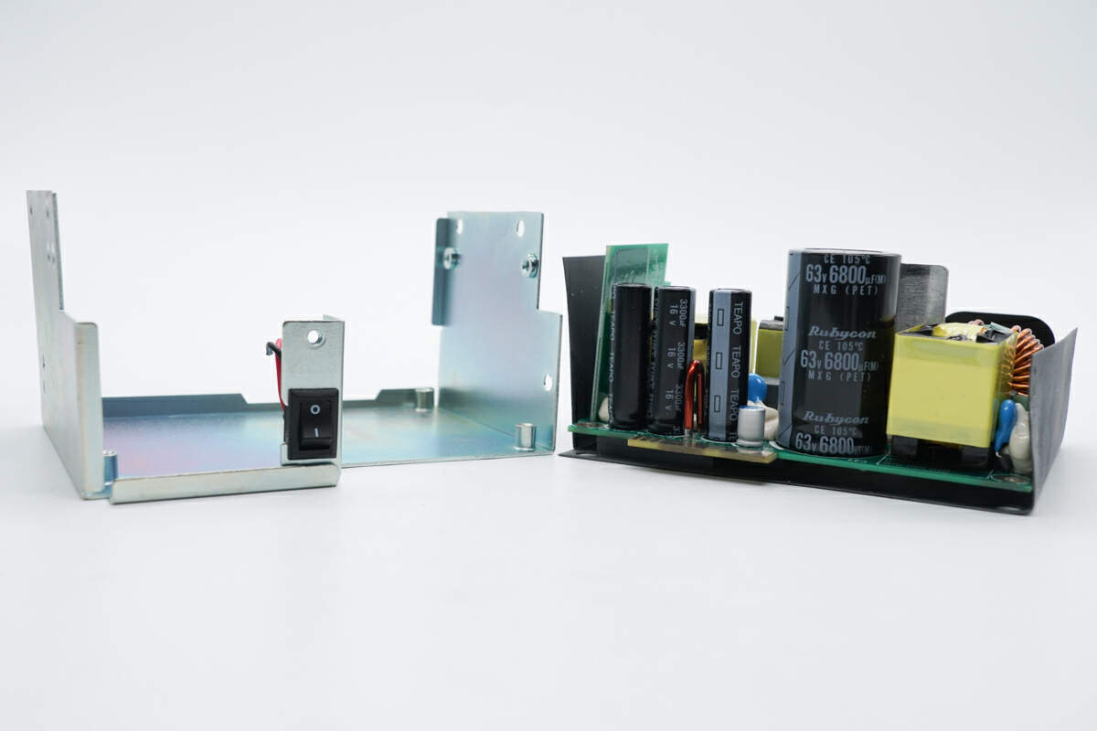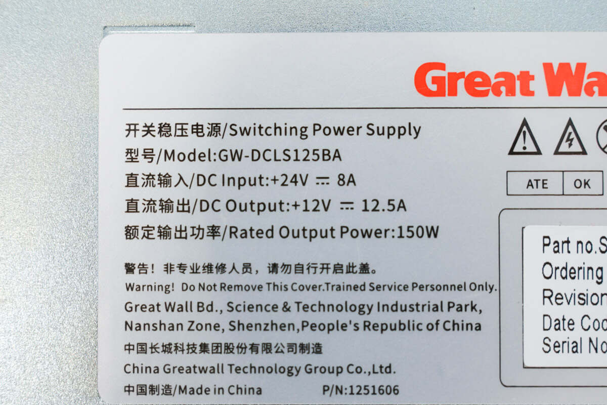 长城这款开关稳压电源采用金属外壳,格栅设计能够更好的利用设备风道散热。电源为直流输入,输入电压为24V。电源输出为12V12.5A,总输出功率为150W。输入采用接线端子连接,输出采用PCB金手指连接,方便组装和维护。