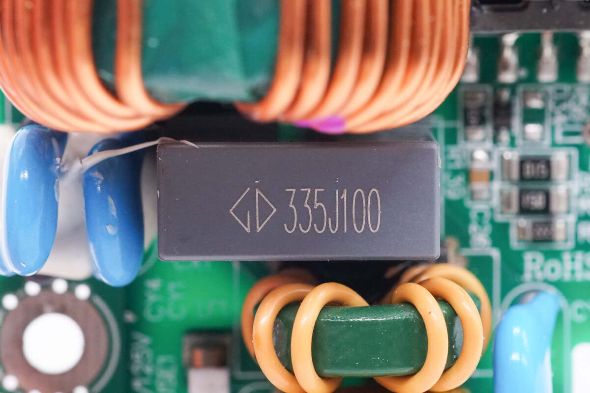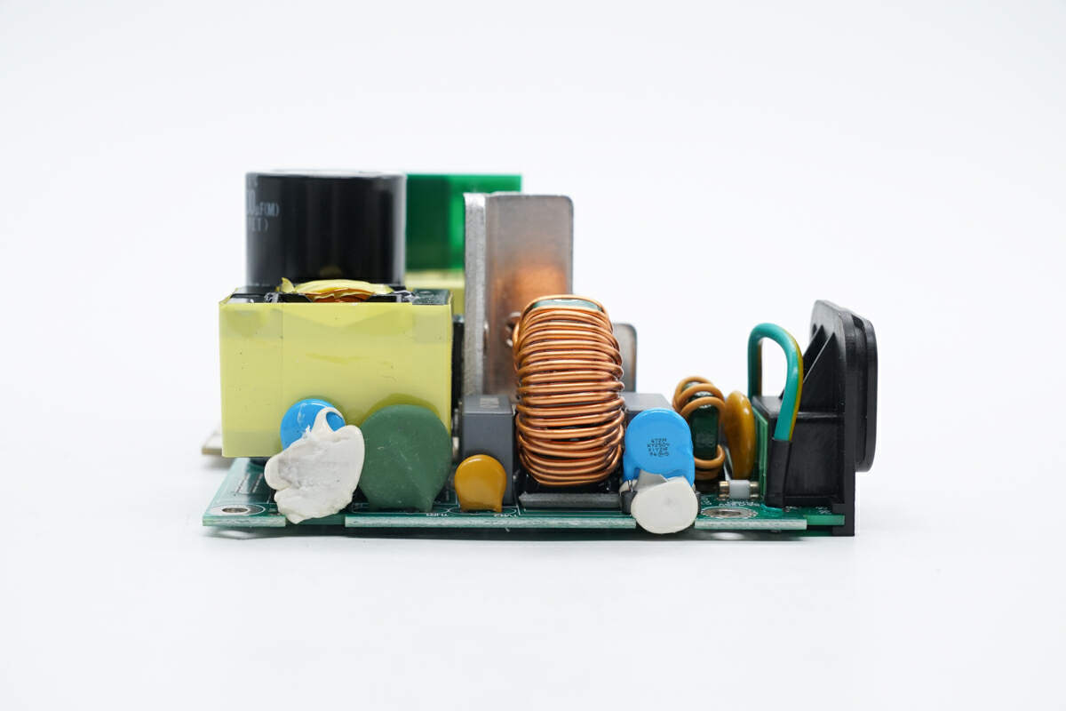 PCBA模块侧面焊接升压电感,NTC浪涌抑制电阻,MOV压敏电阻,两级滤波电感和滤波电容。